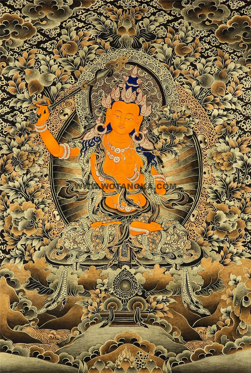 中国唐卡艺术作品中的【文殊菩萨】唐卡手绘布本,热贡知名画师力作,收藏供奉不要错过。作品主尊宝相传神, 采用天然矿石晕染,纯金描线,画工细腻,殊胜,精美、风格富丽,采用24K真金描绘,画工细腻,开脸殊胜,是一副难得一见的好唐卡作品。