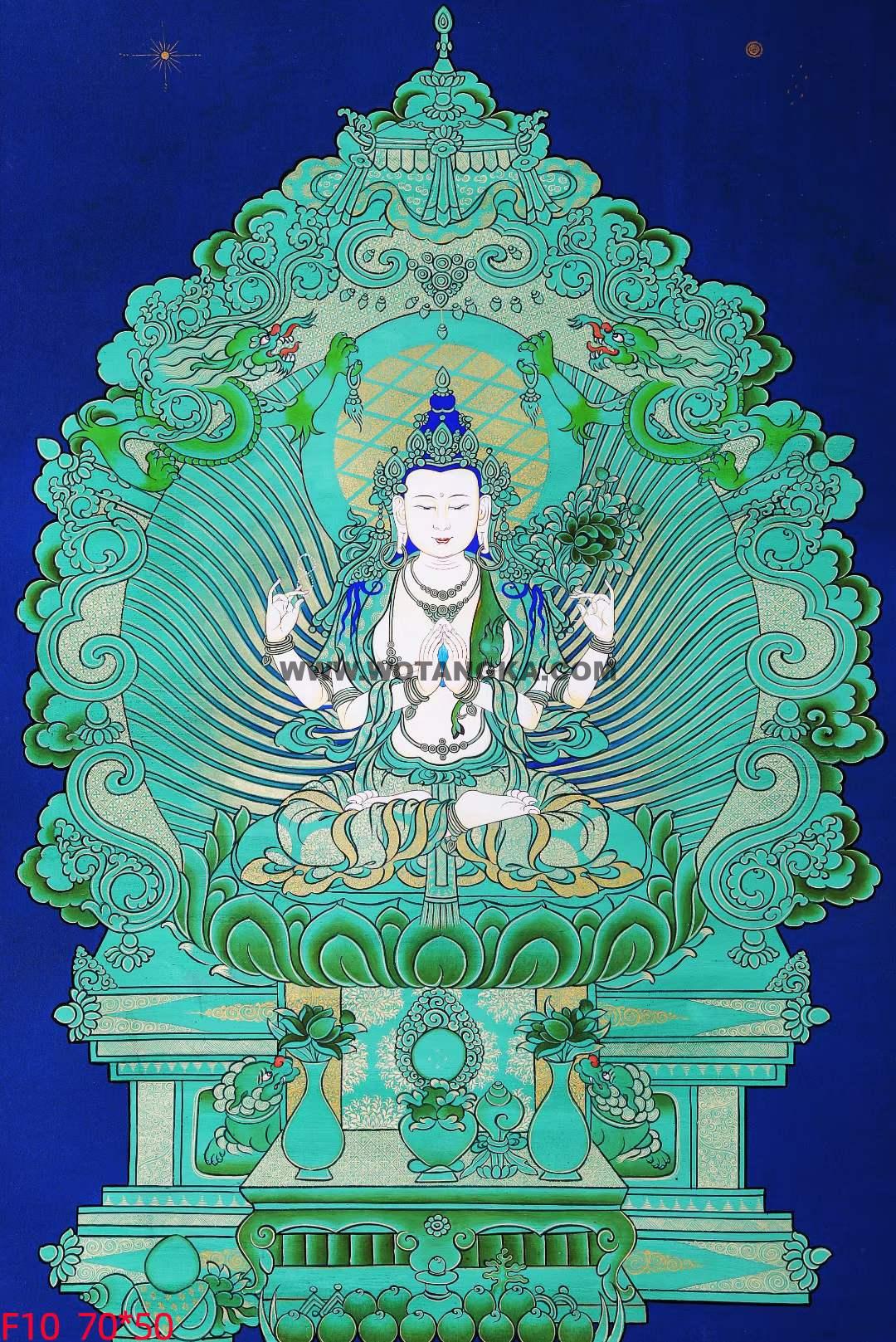四臂观音是雪域西藏的守护神,藏人由老至幼家家户户,皆吟诵其六字大明咒:“嗡嘛呢叭咪吽”。四臂观音与文殊菩萨、金刚手菩萨,合称三族姓尊,代表大悲、大智、大力,为密乘行者人人必修的法门。
