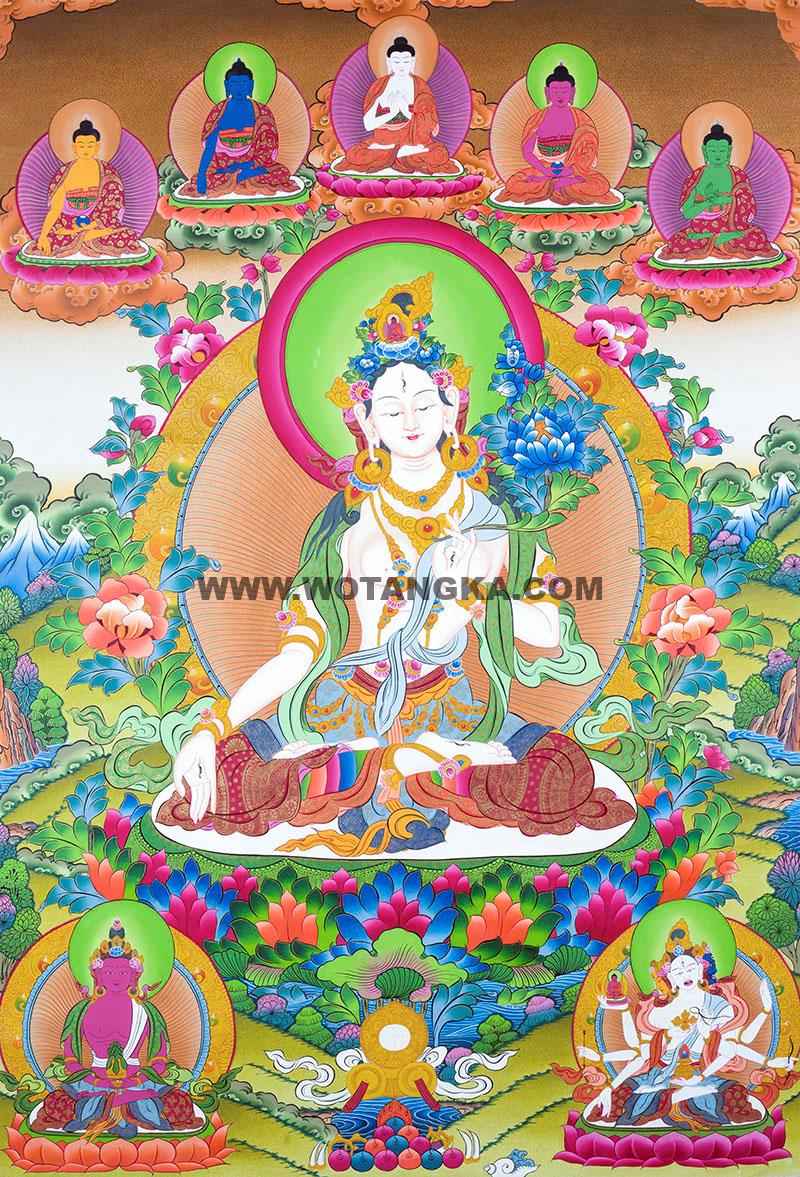 白度母是一切众生尤其是女性的无比圣神,是保佑心想事成、赐寿除障的如意宝。白度母集二十一度母之功德于一身,能消除病痛邪风、妖魔鬼怪等外部之障与贪嗔痴等内部之障,勇猛无比,形随众生,变幻莫测。如果虔诚地修持她的法门,也可以使智慧迅速増长。