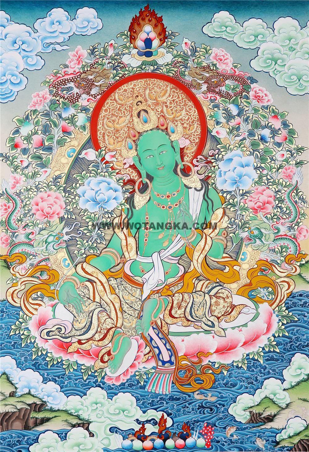 绿度母,梵名Tara,全称圣救度佛母。度母有许多不同的化现,包括有二一度母、五百度母等等,皆为观世音菩萨之化身。相传绿度母是由观世音菩萨的眼泪所化现,为所有度母之主尊,总摄其余二十尊化身之所有功德,是慈悲与绝美的象征。