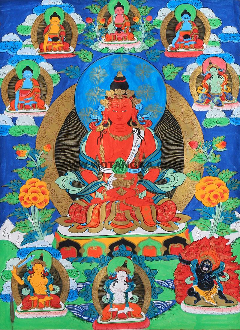 中国唐卡艺术作品中的【长寿佛】唐卡手绘布本,热贡知名画师力作,收藏供奉不要错过。作品主尊宝相传神, 采用天然矿石晕染,纯金描线,画工细腻,殊胜,精美、风格富丽,采用24K真金描绘,画工细腻,开脸殊胜,是一副难得一见的好唐卡作品。
