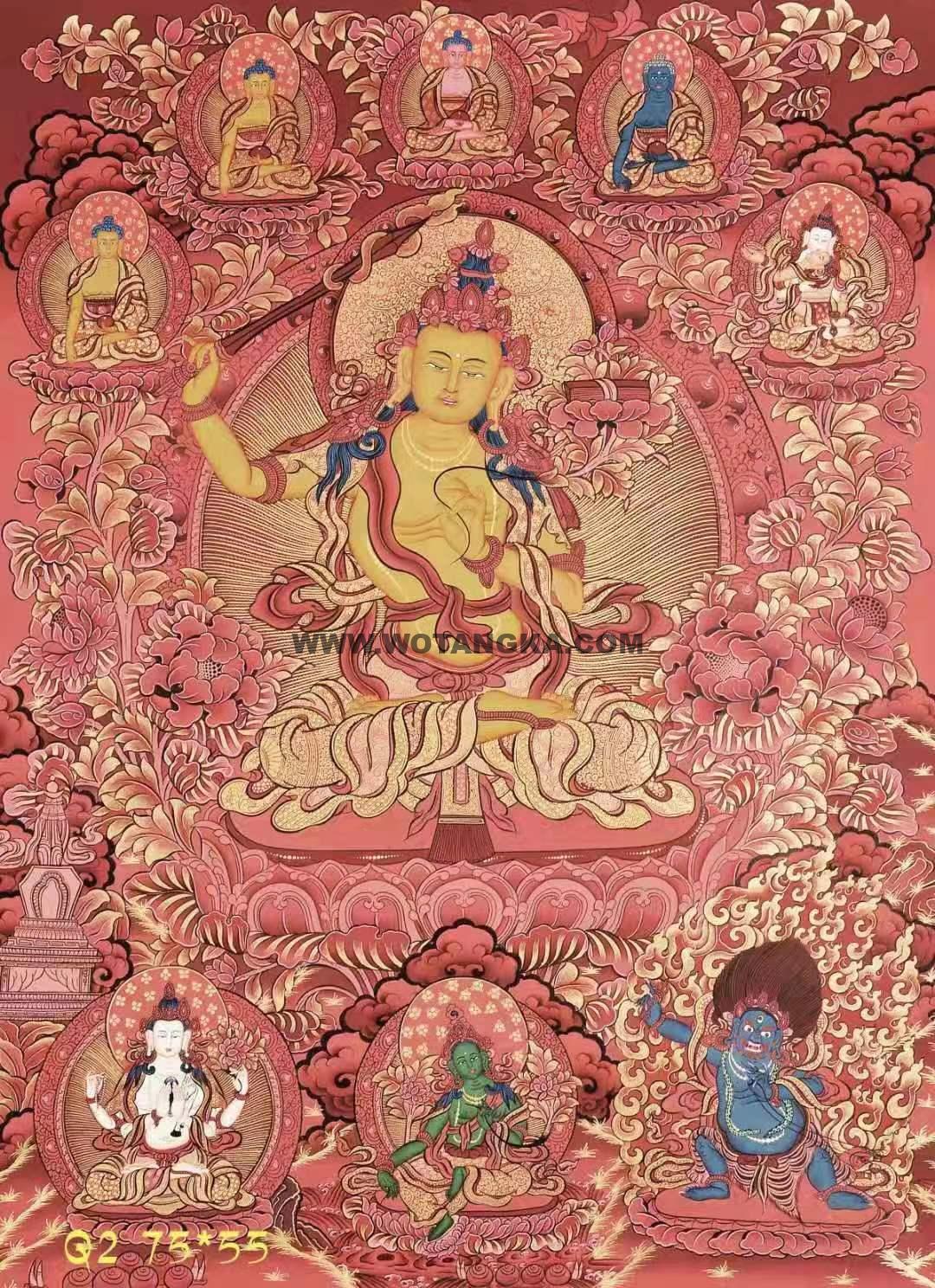 尼泊尔成名画师手绘力作,纯手绘布本唐卡【文殊菩萨·三怙主】,作品采用24K真金金粉混合天然颜料纯手绘而成。作品主尊宝相传神。布图干净精美、画工非常的细腻,严格的遵照佛经的度量仪轨如法绘制,期待有缘人。