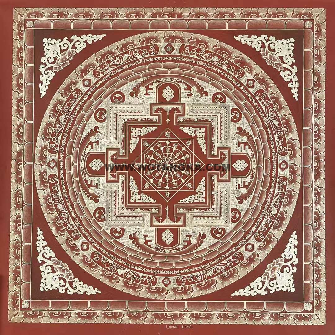 尼泊尔著名坛城大师Lakpa Lama亲工绘制,以纯银为原料将坛城之美体现得淋漓尽致,整幅坛城为红底银唐,坛城结构规整,银线描绘细腻,画工极其精湛,值得收藏。