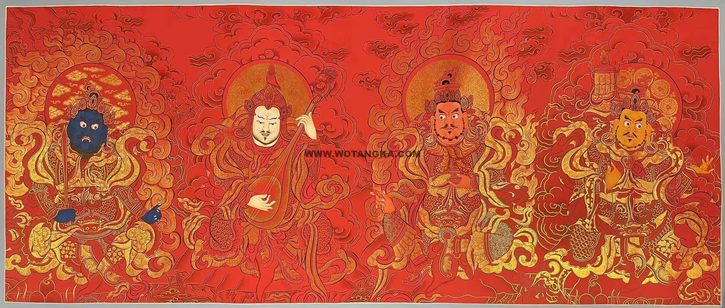 尼泊尔高级唐卡美术工艺大师布塔师傅手绘力作【四大天王】,底色为朱砂研磨沁色晕染,其余色彩均为天染矿物颜料绘制,24K金描金,整幅唐卡画工极为精湛,度量经准确无误,法相殊胜传神,头光部分绘制祥龙戏珠,精美绝伦,堪称神来之笔!其余细节部分处理无不体现大师对于艺术的极致追求,四大天王绘制精湛,开脸传神,是一幅值得珍藏的唐卡!