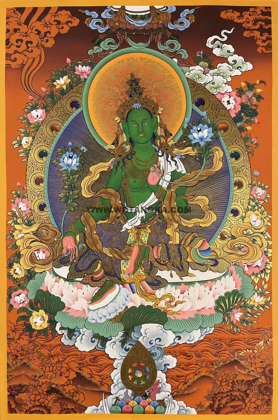 绿度母在藏传佛教中为观世音菩萨的化身(在古印度和藏地,度母法门非常兴盛,许多大德都造有度母仪轨,信仰度母的人就像信仰文殊菩萨、观音菩萨的人一样非常多。度母,梵名Tara,全称圣救度佛母,我国古代称多罗菩萨、多罗观音,度母有许多不同的化现,包括有二十一度母、五百度母等等,皆为观世音菩萨之化身,而绿度母为所有度母之主尊,总摄其余二十尊化身之所有功德,她能救八种苦难,如狮难、象难、蛇难、水难、牢狱难、贼难、非人难,又称为“救八难度母”。同时,还能把称为五毒的人类行为贪、嗔、痴、慢、疑中的“疑”转成究竟圆满的智慧,有护持妇妇幼儿的功德。本尊心咒具足一切息增怀诛之功用,消除一切众生的烦恼痛苦、满足一切众生愿求,现世富贵长寿平安吉祥、除诸病苦业魔障碍等,帮助众生解脱生死苦海,命终往生极乐世界,获得究竟的安乐,因为其救度之迅速、摧灭魔业之勇猛,故又称作“救度速勇母”。