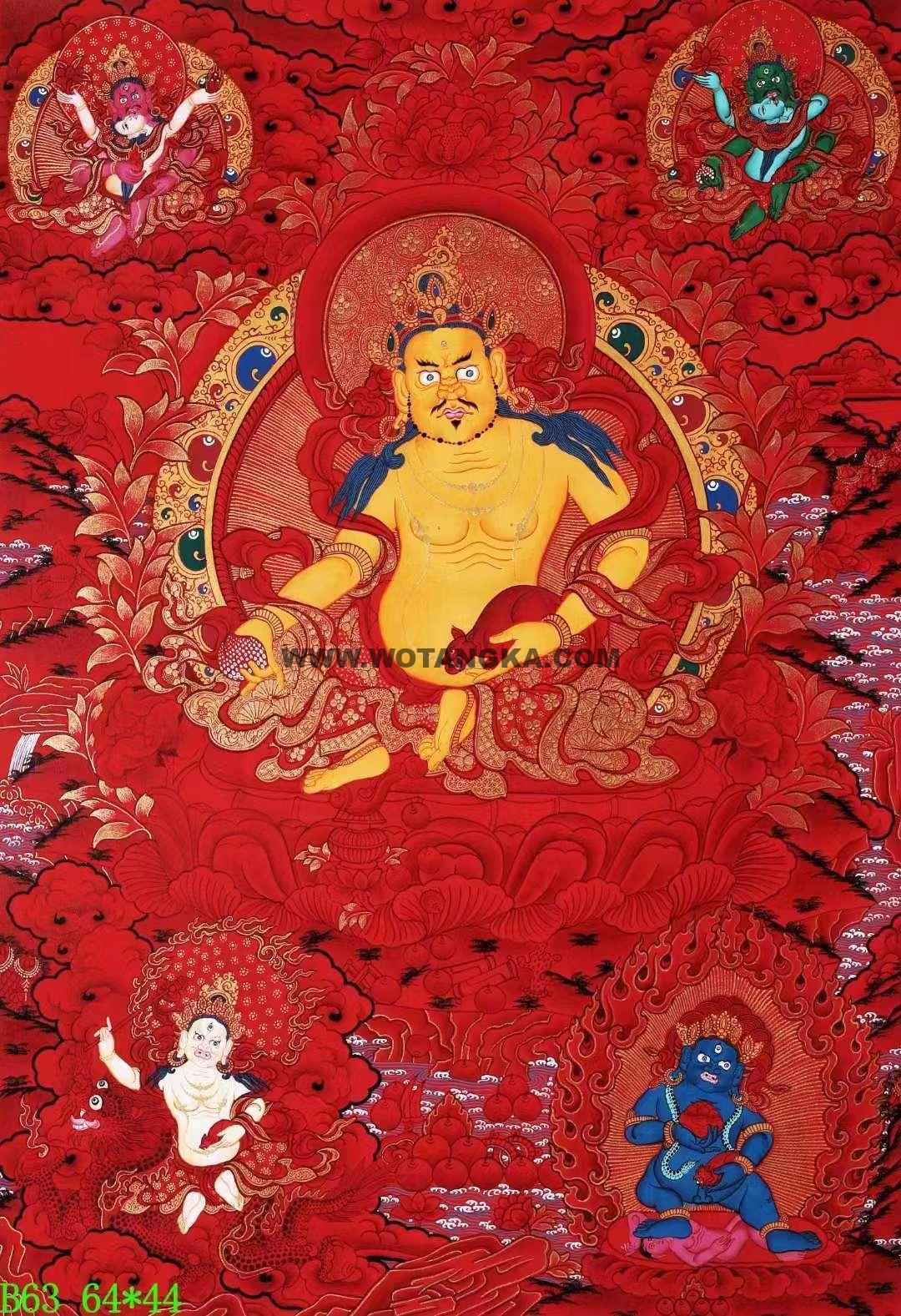 尼泊尔知名唐卡画师手绘力作【五方财神】,底色为朱砂研磨沁色晕染,其余色彩均为天染矿物颜料绘制,主尊黄财神度量经准确无误,法相殊胜传神。