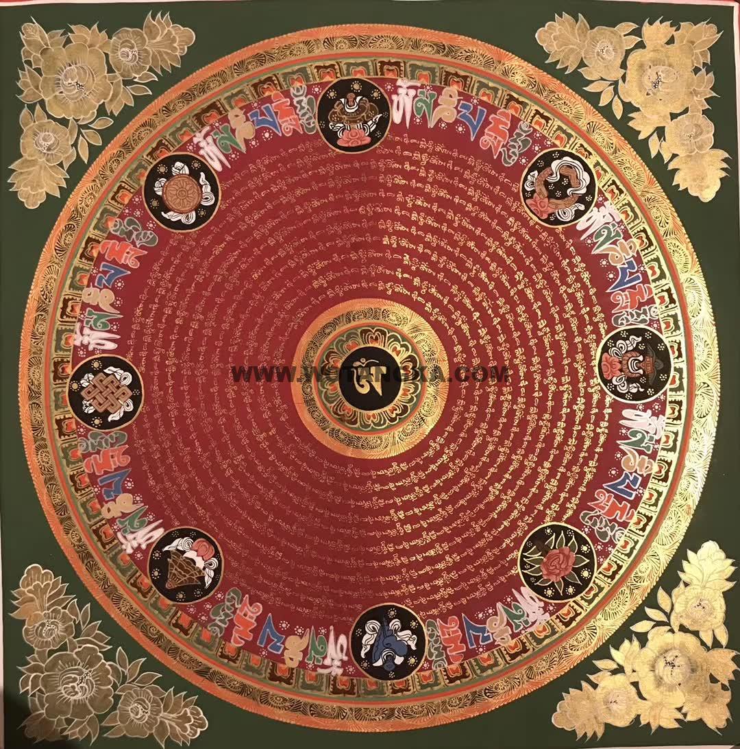 尼泊尔知名唐卡大师作品《吉祥八宝坛城》,作品采用24K真金磨粉描线,混合天然颜料纯手绘而成。作品主尊宝相传神,布图干净精美、画工非常的细腻,严格的遵照佛经的度量仪轨如法绘制,期待有缘人。