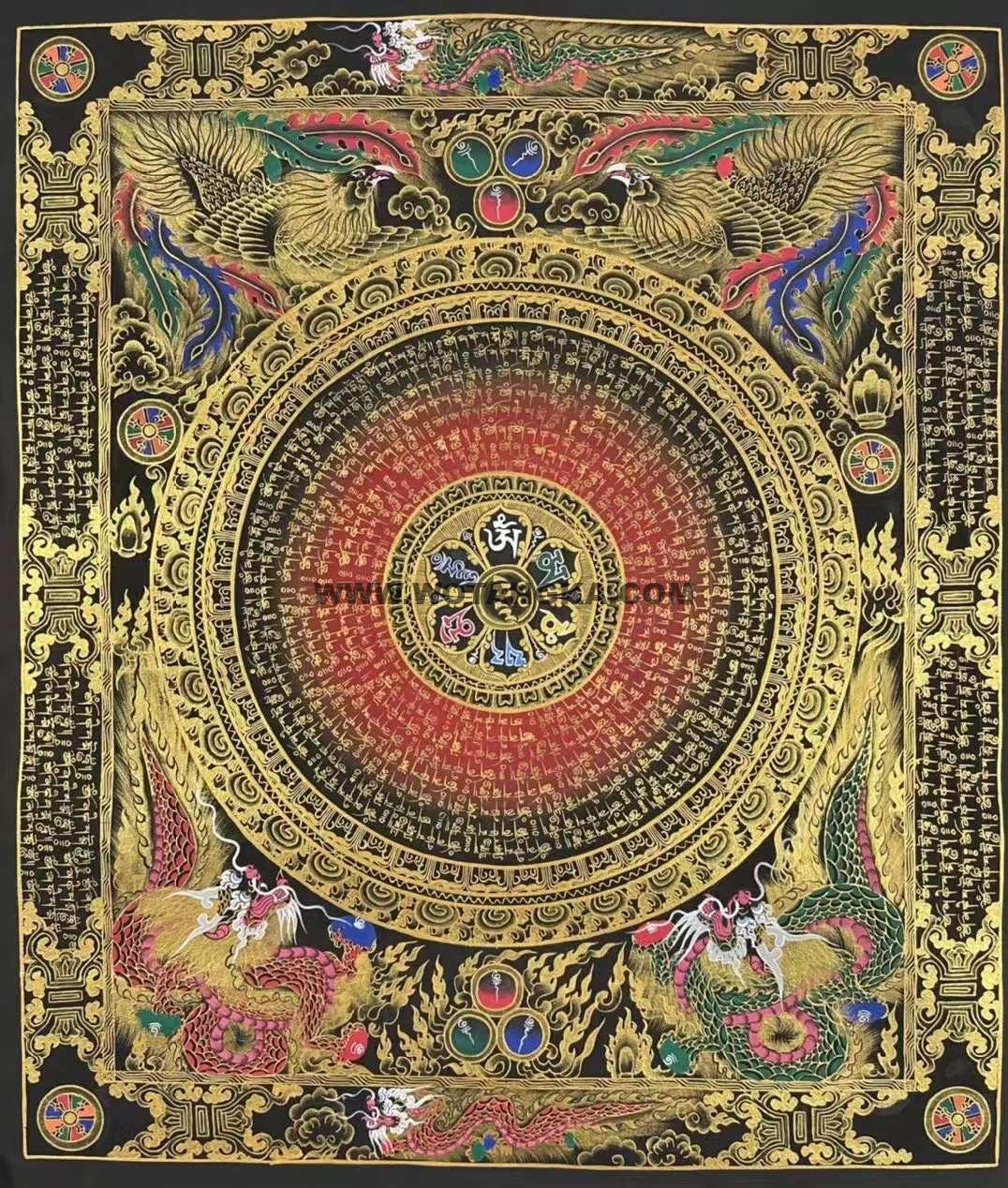 尼泊尔知名唐卡画师亲绘《六字真言龙凤坛城》,唐卡 画工精美细腻,金线如发丝,晕染和描金相当的完美,难得的高品质精品唐卡。作品采用24K真金描线,天然矿石颜料着色晕染。画工细腻,开脸殊胜,是一副难得一见的好唐卡。