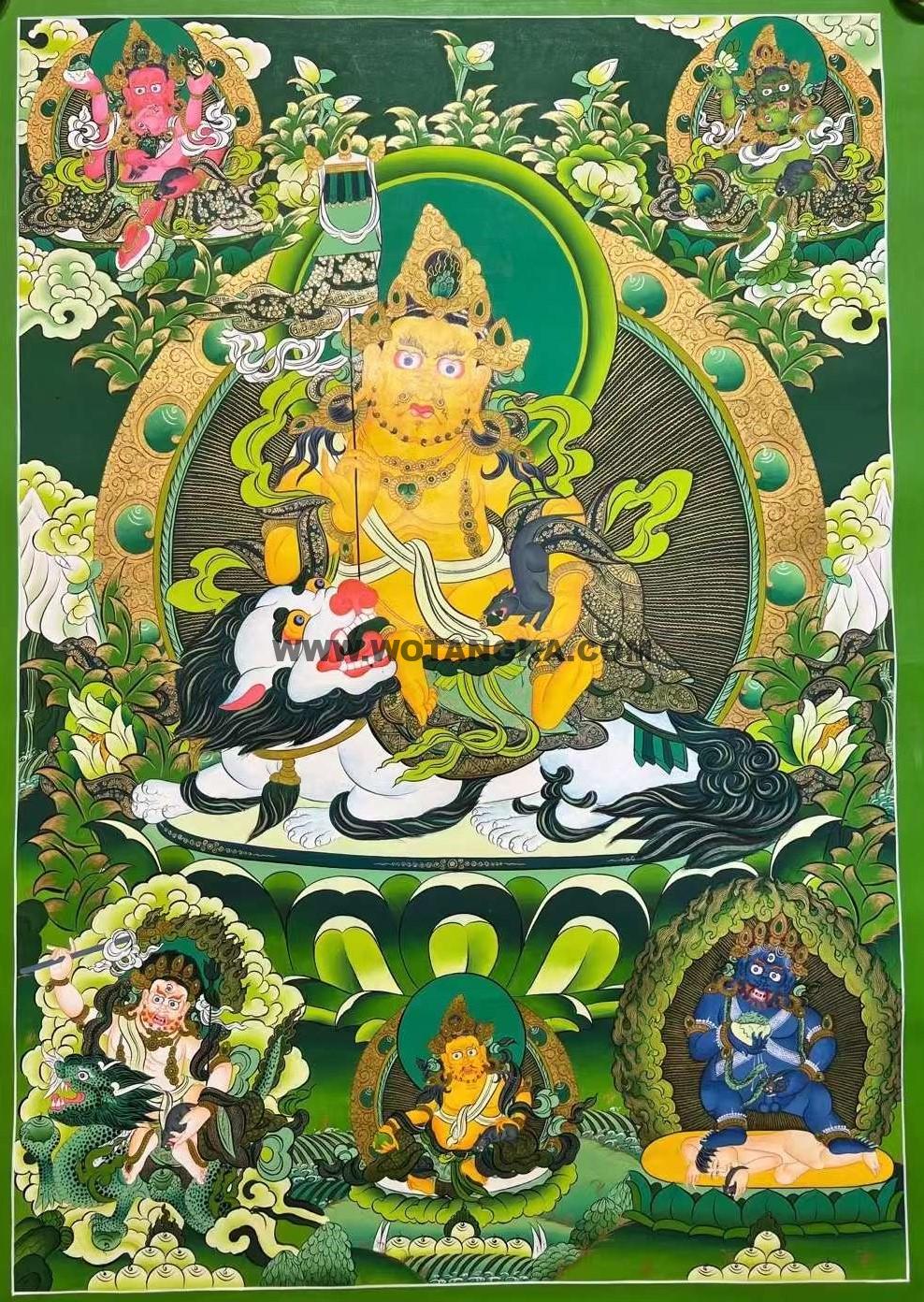 尼泊尔知名唐卡画师力作《财宝天王》 唐卡手绘布本,采用天然矿物、宝石、植物、24K真金描绘。天然矿石颜料着色晕染,画工细腻,开脸殊胜,是一副难得一见的好唐卡作品。喜欢不要错过。
