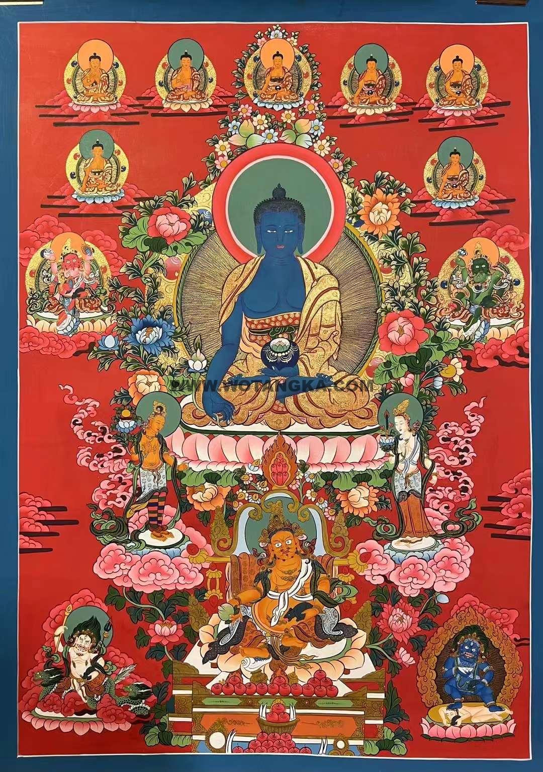 尼泊尔知名唐卡画师手绘力作【药师佛】,底色为天然矿物染料研磨沁色晕染,其余色彩均为天染矿物颜料绘制,主尊黄财神度量经准确无误,法相殊胜传神。