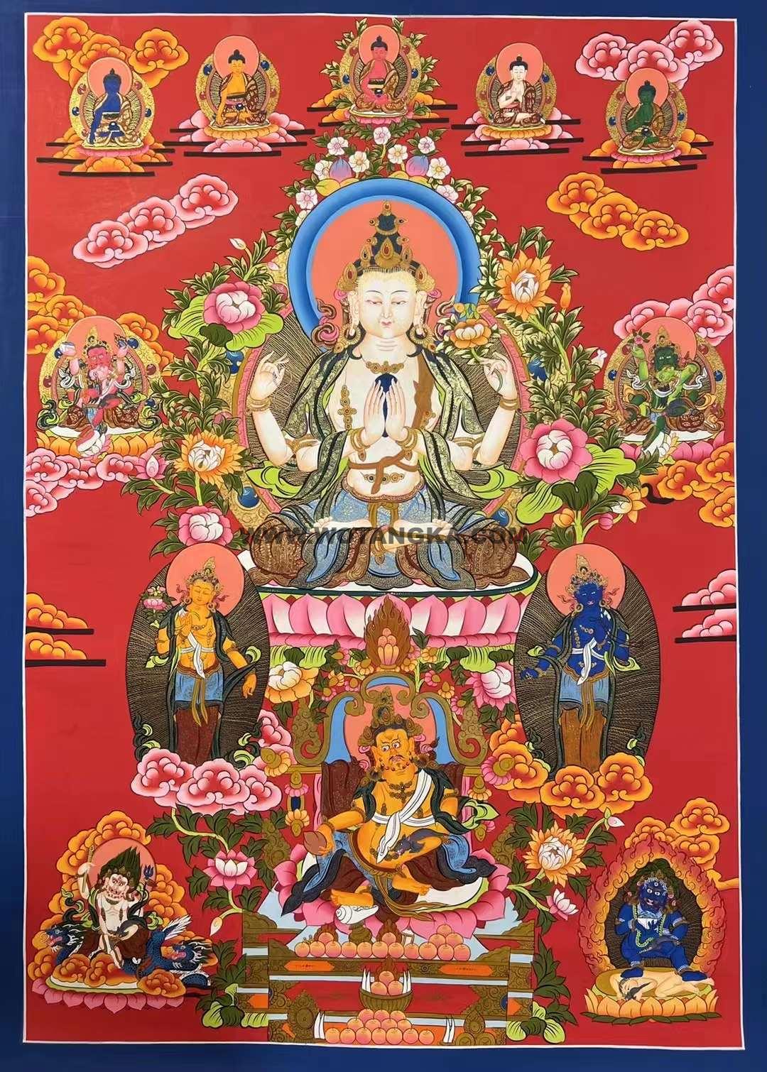 尼泊尔知名唐卡画师手绘力作【四臂观音】,底色为天然矿物染料研磨沁色晕染,其余色彩均为天染矿物颜料绘制,主尊黄财神度量经准确无误,法相殊胜传神。