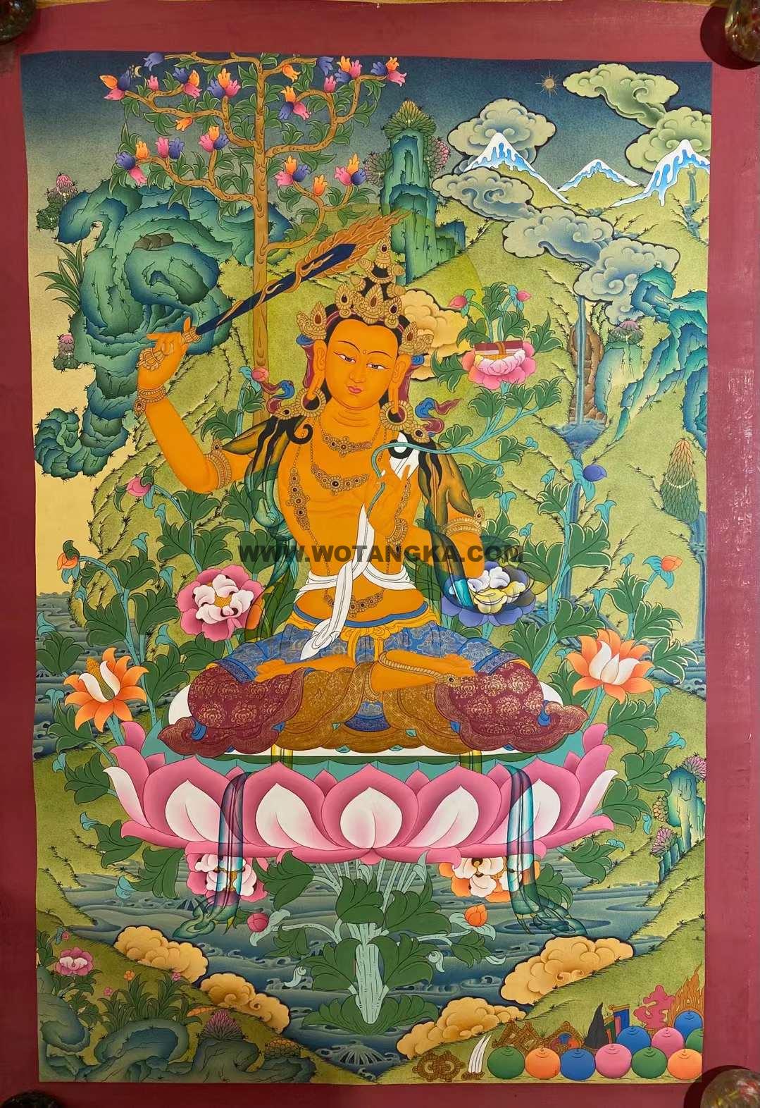 尼泊尔知名唐卡画师作品,纯手绘布本唐卡【文殊菩萨】,作品采用24K真金金粉混合天然颜料纯手绘而成。作品主尊宝相传神。布图干净精美、画工非常的细腻,严格的遵照佛经的度量仪轨如法绘制,期待有缘人。