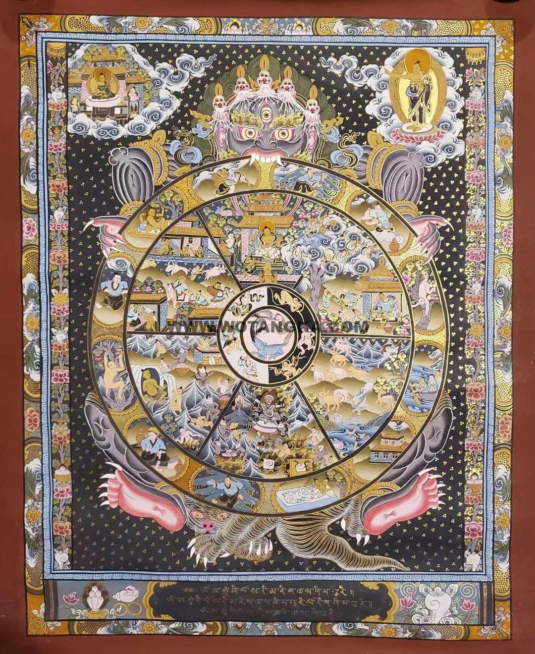 六道轮回图此类唐卡题材较为少见,整个画面是一个巨大的轮,被一位赤色的阎罗法王拥抱着。阎罗法王以獠牙锯齿衔着轮的上部,三目圆睁,五骷髅冠,下部露着明王的双脚和虎皮裙,表示芸芸众生都被佛法统捏着。