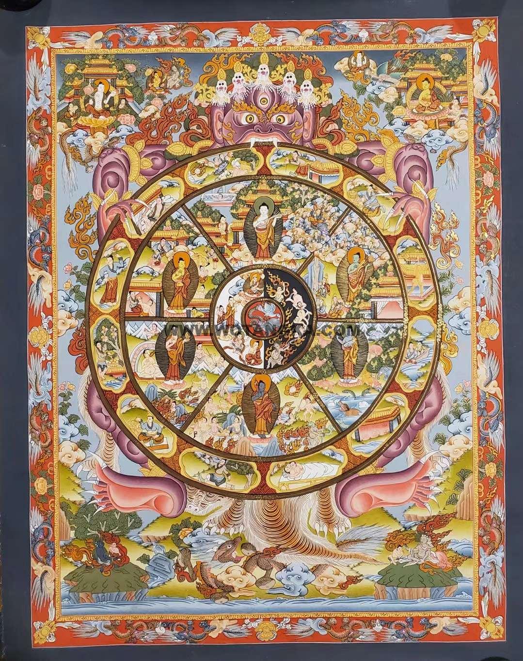 六道轮回图此类唐卡题材较为少见,整个画面是一个巨大的轮,被一位赤色的阎罗法王拥抱着。阎罗法王以獠牙锯齿衔着轮的上部,三目圆睁,五骷髅冠,下部露着明王的双脚和虎皮裙,表示芸芸众生都被佛法统捏着。