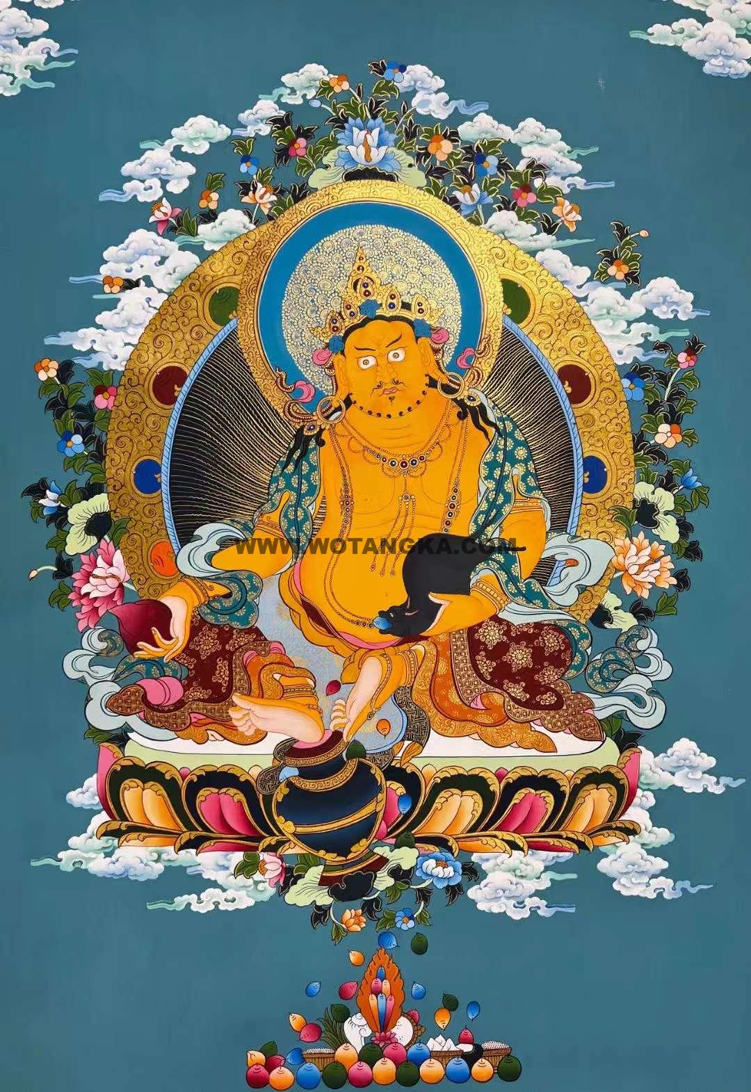 尼泊尔知名唐卡画师作品,纯手绘布本唐卡【黄财神】,作品采用24K真金金粉混合天然颜料纯手绘而成。作品主尊宝相传神。布图干净精美、画工非常的细腻,严格的遵照佛经的度量仪轨如法绘制,期待有缘人。