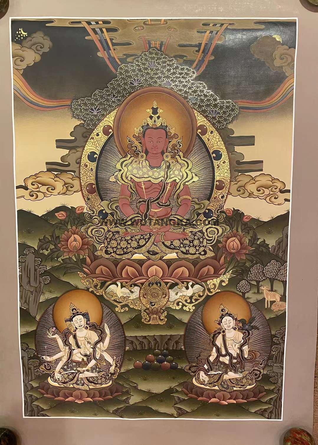 尼泊尔成名画师力作纯手绘布本唐卡【长寿佛·长寿三尊】,唐卡采用24K真金金粉混合天然颜料纯手绘而成。作品主尊宝相传神。布图干净精美、画工非常的细腻,严格的遵照佛经的度量仪轨如法绘制,期待有缘人。