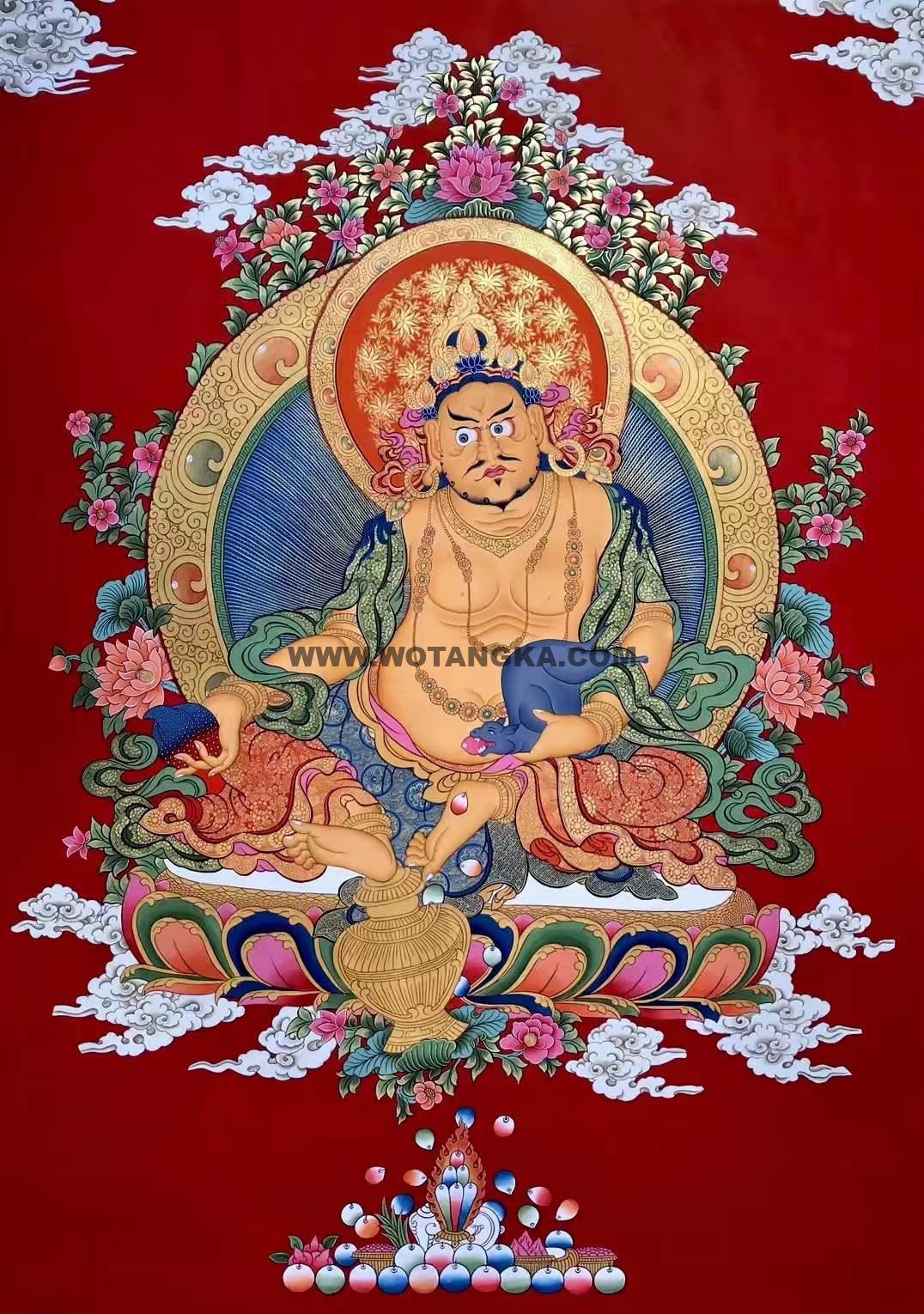 黄财神为北方司财众部之首领,掌无尽宝库,修此法者,可消灭六道穷苦,增长福德、寿命、智慧, 以及一切物质与精神上的受用。心灵上得到满足。黄财神是藏传佛教各大教派普遍供养的五姓财神之一,因其身相黄色,故称黄财神。修持黄财神法、持诵其密咒,可获得黄财神庇佑,能增长福德、寿命、智能、物质及精上之受用,不被生活所逼,以及一切经济压迫,可安心向道。但修法者需发无上菩提心,广结善缘,勤行布施。万勿悭贪成性,护法降罪也. 黄财神面慈目善,头戴宝冠,坦胸露腹,戴着珍宝璎珞、珍宝耳环、珍宝手镯和珍宝足钏,上身穿丝制天衣,下身着丝制裙子,右手于右膝上捧喷焰末尼,左手握着吐宝鼬,以威镇坐姿坐在莲花宝座中央。身后有光环、祥云、远山。能增长福德、寿命、智慧、物质及精神上之受用。主司财富,能使一切众生脱于贫困,财源广进。