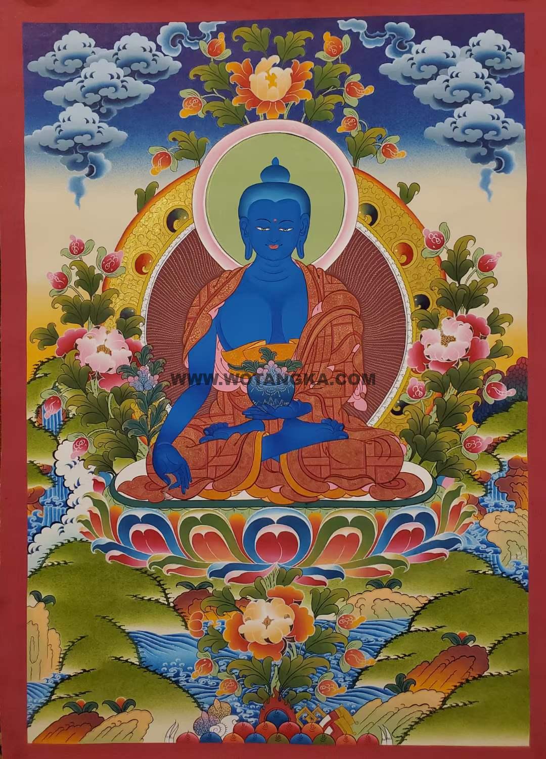 尼泊尔成名画师手绘力作,纯手绘布本唐卡【药师佛】,作品采用24K真金金粉混合天然颜料纯手绘而成。作品主尊宝相传神。布图干净精美、画工非常的细腻,严格的遵照佛经的度量仪轨如法绘制,期待有缘人。