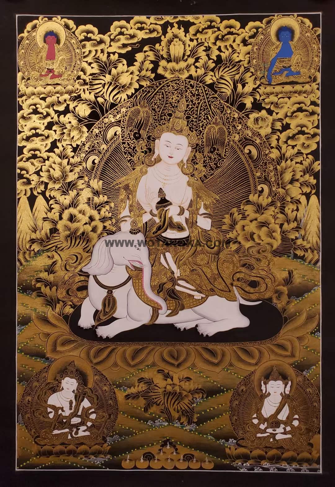 尼泊尔精品唐卡《普贤菩萨》唐卡手绘布本。采用24K真金描线,天然矿石颜料着色晕染。画工细腻,开脸殊胜,是一副难得一见的好唐卡。