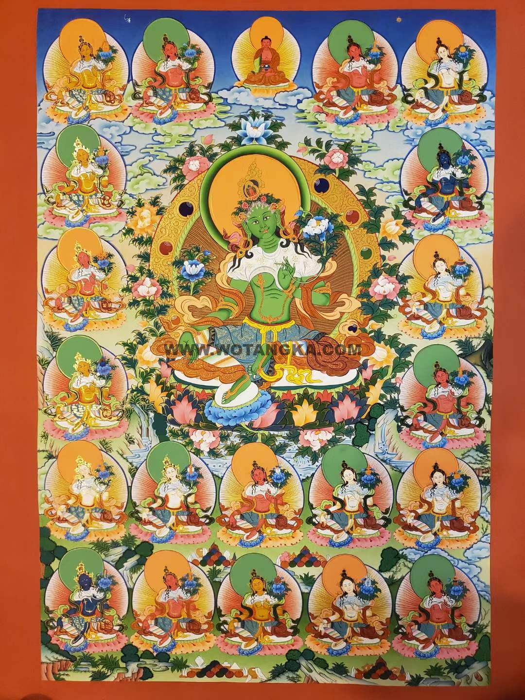 尼泊尔画师力作纯手绘布本唐卡【二十一度母】。作品采用金粉混合天然颜料纯手绘而成。天然矿石颜料着色晕染,画工细腻,开脸殊胜,面容福德吉祥,作品主尊宝相传神。布图干净精美、画工非常的细腻,严格的遵照佛经的度量仪轨如法绘制,期待有缘人。