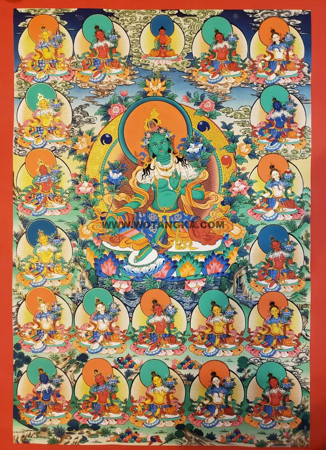 二十一度母,藏语称“卓玛聂久”,是度脱和拯救苦难众生的一族女神,同时也是藏传佛教诸宗派崇奉的女性本尊群。因此二十一位度母在藏族地区被广大信徒或百姓普遍敬拜,有着极大的吸引力。 度母有许多不同的身色,括囊有六,即白、红、蓝、黄、绿、黑等六色。白色表度母之身,红色表度母之语,黑蓝色表度母之意,黄色表度母之功德,事业则以绿色作代表。度母是示现为女性菩萨形象的佛,度母的含义是度脱灾难和痛苦。