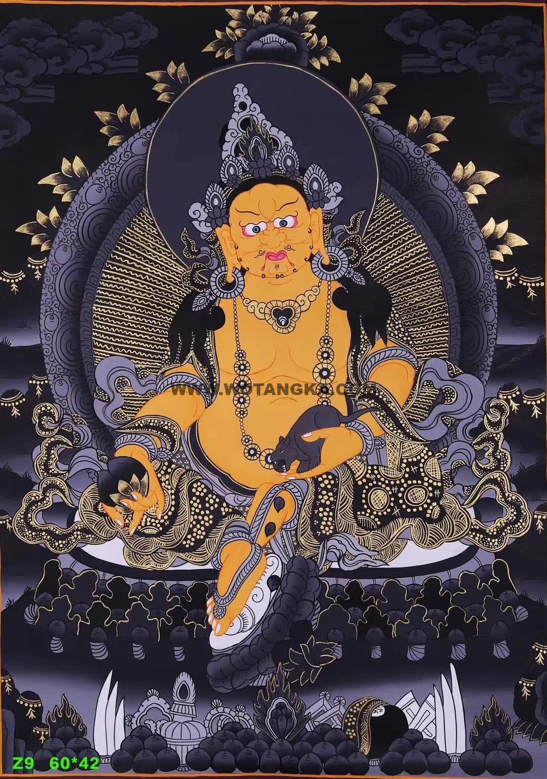 黄财神为北方司财众部之首领,掌无尽宝库,修此法者,可消灭六道穷苦,增长福德、寿命、智慧, 以及一切物质与精神上的受用。心灵上得到满足。黄财神是藏传佛教各大教派普遍供养的五姓财神之一,因其身相黄色,故称黄财神。修持黄财神法、持诵其密咒,可获得黄财神庇佑,能增长福德、寿命、智能、物质及精上之受用,不被生活所逼,以及一切经济压迫,可安心向道。但修法者需发无上菩提心,广结善缘,勤行布施。万勿悭贪成性,护法降罪也. 黄财神面慈目善,头戴宝冠,坦胸露腹,戴着珍宝璎珞、珍宝耳环、珍宝手镯和珍宝足钏,上身穿丝制天衣,下身着丝制裙子,右手于右膝上捧喷焰末尼,左手握着吐宝鼬,以威镇坐姿坐在莲花宝座中央。身后有光环、祥云、远山。能增长福德、寿命、智慧、物质及精神上之受用。主司财富,能使一切众生脱于贫困,财源广进。