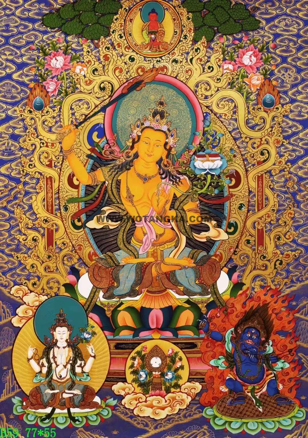 尼泊尔成名画师手绘力作,纯手绘布本唐卡【文殊菩萨·三怙主】,作品采用24K真金金粉混合天然颜料纯手绘而成。作品主尊宝相传神。布图干净精美、画工非常的细腻,严格的遵照佛经的度量仪轨如法绘制,期待有缘人。