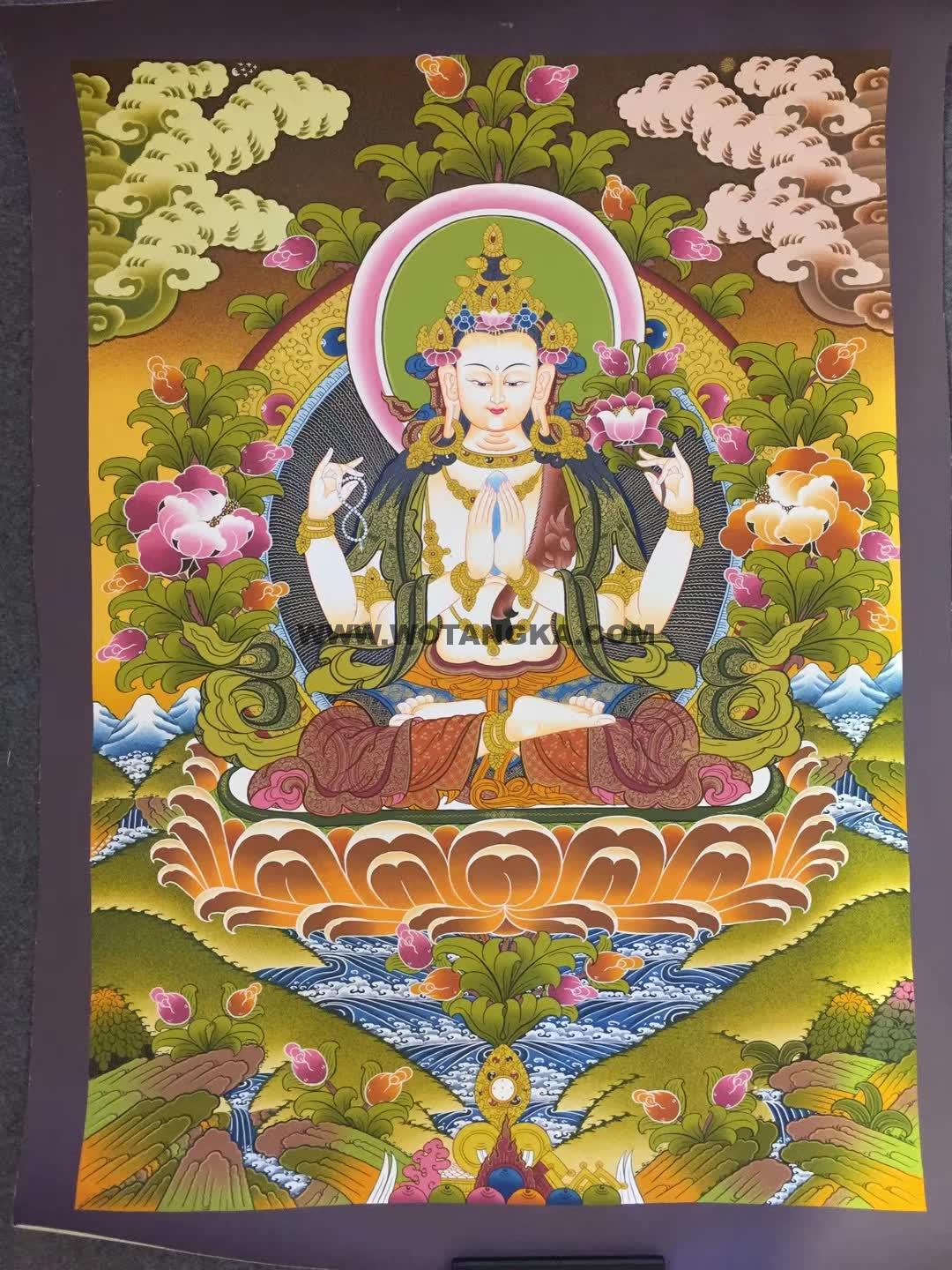 尼泊尔成名画师手绘力作,纯手绘布本唐卡【四臂观音】,作品采用24K真金金粉混合天然颜料纯手绘而成。作品主尊宝相传神。布图干净精美、画工非常的细腻,严格的遵照佛经的度量仪轨如法绘制,期待有缘人。