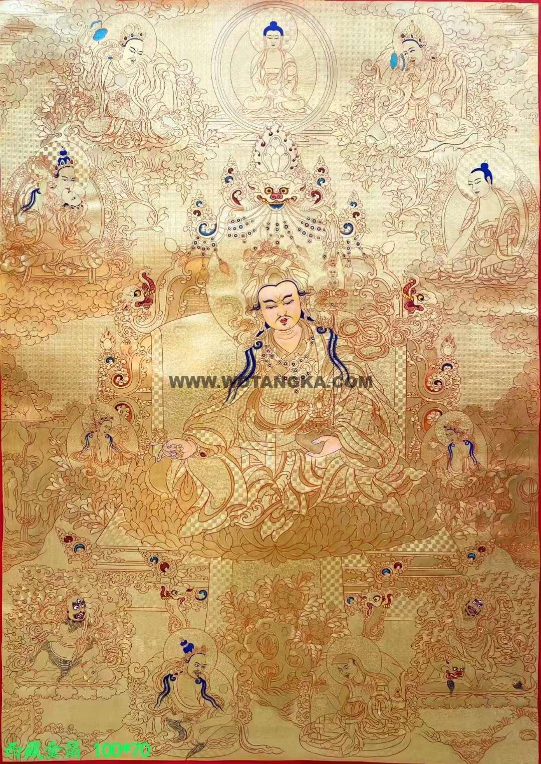 中国唐卡艺术作品中的【莲花生大士·莲师八相】唐卡手绘布本,西藏知名画师力作,收藏供奉不要错过。作品主尊宝相传神。金箔唐卡也叫刻金唐卡,先在布面上施以金粉或者金箔,再铅笔打底稿,矿物颜料勾勒晕染,最后用玛瑙刀雕刻出花纹,绘制过程非常复杂,绘制周期也比普通唐卡更长,而且绘制成本极高,因此这类唐卡市面上非常罕见,收藏价值不言而喻。