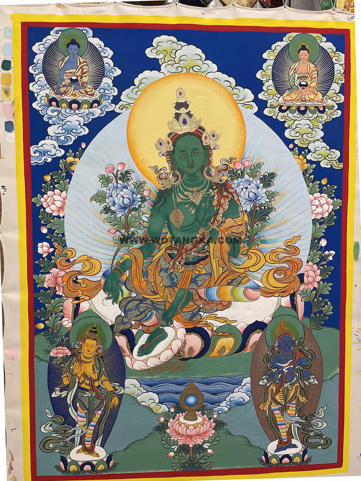 中国唐卡艺术作品中的【绿度母】唐卡手绘布本,热贡知名画师,民间工艺师维玛扎西力作,收藏供奉不要错过。作品主尊宝相传神, 采用天然矿石晕染,纯金描线,画工细腻,殊胜,精美、风格富丽,采用24K真金描绘,画工细腻,开脸殊胜,是一副难得一见的好唐卡作品。