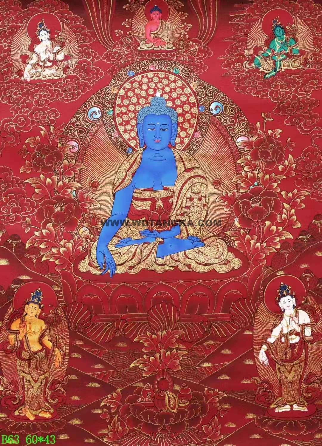 尼泊尔精品唐卡,尼泊尔知名画师《药师佛》唐卡手绘布本。采用24K真金描线,红底色打底,天然矿石颜料着色晕染。画工细腻,开脸殊胜,是一副难得一见的好唐卡。作品主尊宝相传神,布图干净精美、画工非常的细腻,严格的遵照佛经的度量仪轨如法绘制,期待有缘人。