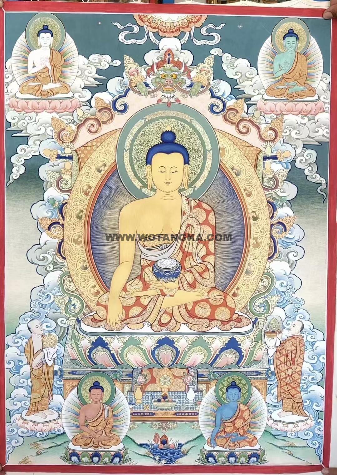 中国唐卡艺术作品中的【释迦牟尼佛·五方佛】唐卡手绘布本,热贡知名画师,民间工艺师角巴加力作,收藏供奉不要错过。作品主尊宝相传神, 采用天然矿石晕染,纯金描线,画工细腻,殊胜,精美、风格富丽,采用24K真金描绘,画工细腻,开脸殊胜,是一副难得一见的好唐卡作品。