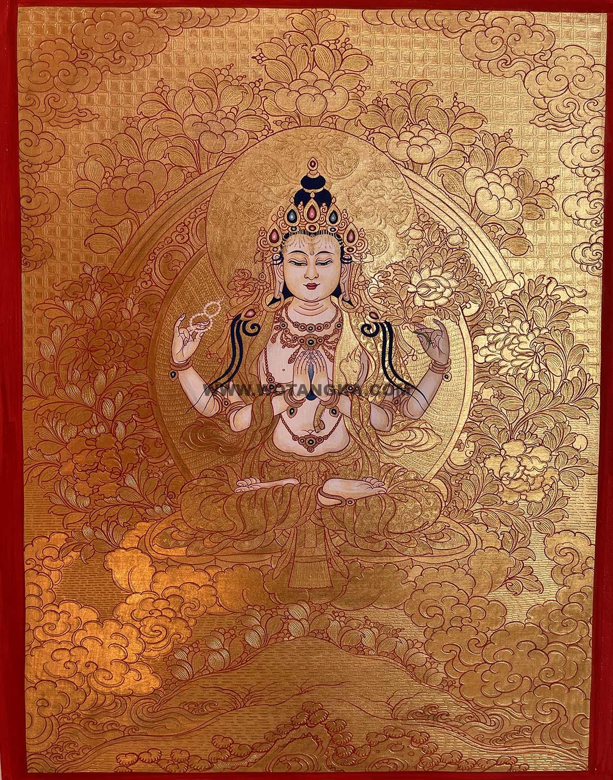 中国唐卡艺术作品中的【四臂观音】唐卡手绘布本,热贡知名画师,民间工艺师角巴加力作,收藏供奉不要错过。作品主尊宝相传神, 采用天然矿石晕染,纯金描线,画工细腻,殊胜,精美、风格富丽,采用24K真金描绘,画工细腻,开脸殊胜,是一副难得一见的好唐卡作品。
