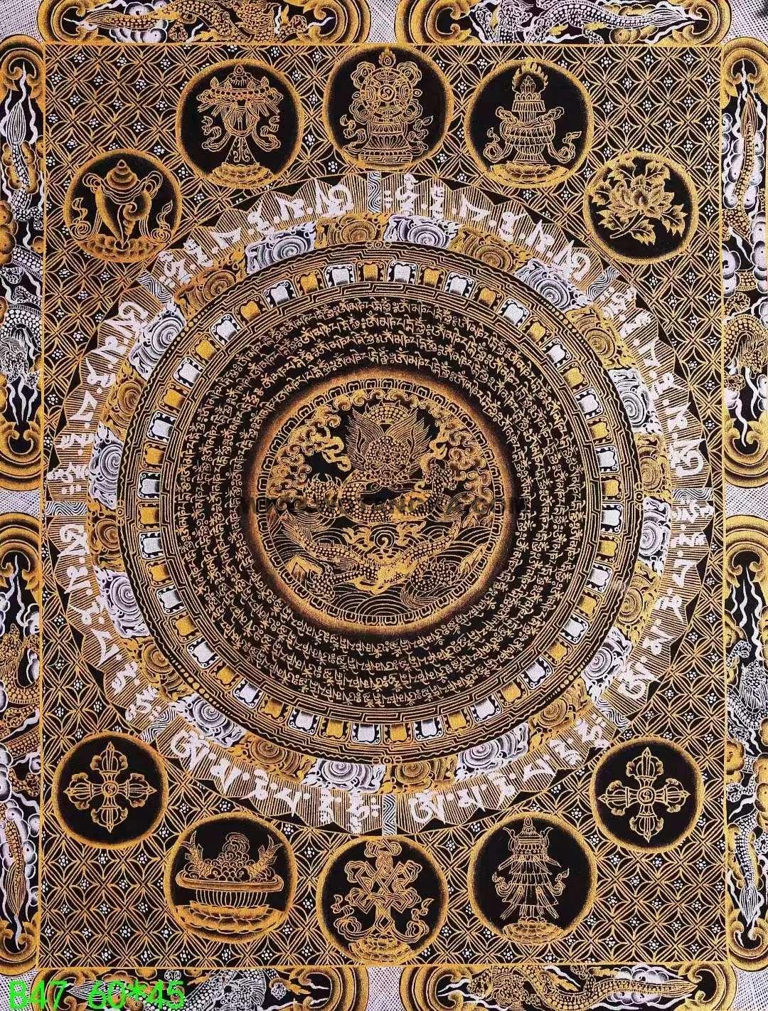 尼泊尔知名唐卡大师作品《吉祥八宝龙坛城》,作品采用黑底色打底,24K真金磨粉描线,混合天然颜料纯手绘而成。作品主尊宝相传神,布图干净精美、画工非常的细腻,严格的遵照佛经的度量仪轨如法绘制,期待有缘人。