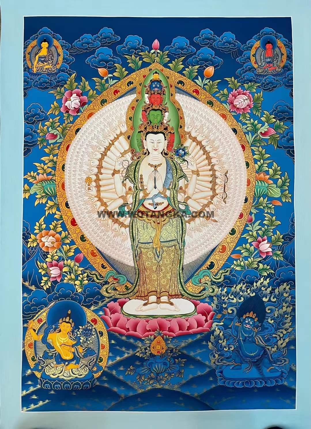 尼泊尔知名唐卡画师作品《千手观音·三怙主》,作品采用24K真金描线,混合天然颜料纯手绘而成。作品主尊宝相传神,布图干净精美、画工非常的细腻,严格的遵照佛经的度量仪轨如法绘制,期待有缘人。