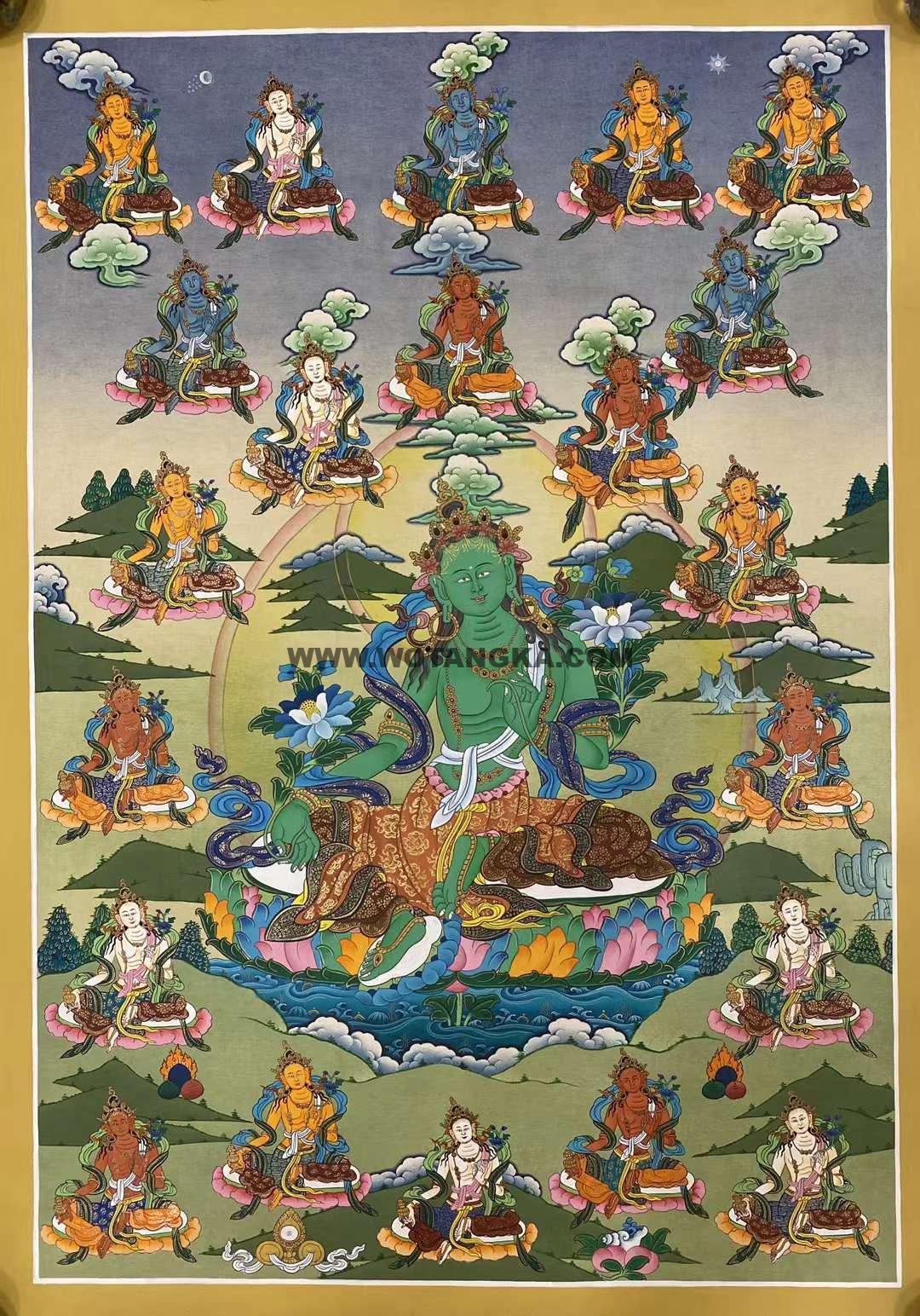 尼泊尔画师力作纯手绘布本唐卡【二十一度母】。作品采用金粉混合天然颜料纯手绘而成。天然矿石颜料着色晕染,画工细腻,开脸殊胜,面容福德吉祥,作品主尊宝相传神。布图干净精美、画工非常的细腻,严格的遵照佛经的度量仪轨如法绘制,期待有缘人。