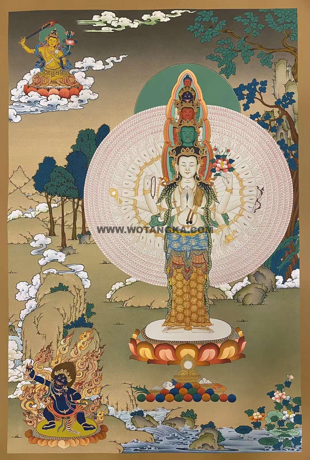 嘎玛嘎赤画派精品唐卡,成名嘎玛嘎赤画派画师手绘唐卡《千手观音·三怙主》。嘎玛嘎赤画派属于藏族唐卡的三大流派(勉唐画派、钦则画派、嘎玛嘎赤画派)之一,流行于藏区东部,以四川省甘孜德格和西藏昌都为中心,相传在16世纪由南喀扎西活佛创建,以嘎玛巴大法会而得名,又译“嘎玛嘎赤画派”,亦简称“嘎赤派”。嘎玛嘎赤唐卡用彩色矿物颜料工笔绘制,所以历经数百年,作品色泽依然鲜艳无比。嘎玛嘎赤唐卡具有绘制精美、造型夸张、色彩对比强烈的特点,多运用纯色平涂、金色勾线的手法。其总体风格形成了有别于卫藏地区勉塘、钦泽两大画派的特征。