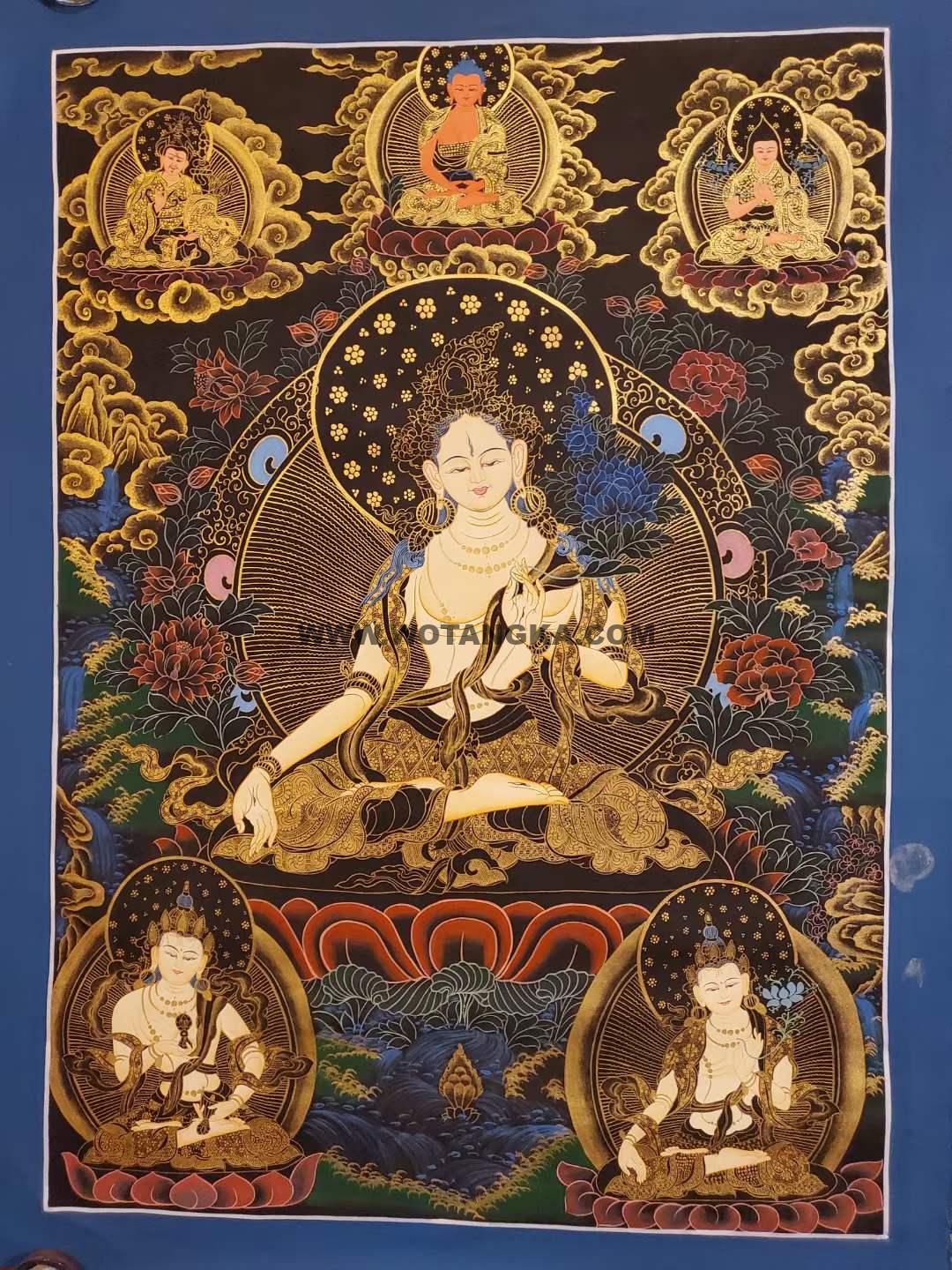 尼泊尔画师力作纯手绘布本唐卡【白度母】。作品采用金粉混合天然颜料纯手绘而成。作品主尊宝相传神。布图干净精美、画工非常的细腻,严格的遵照佛经的度量仪轨如法绘制,期待有缘人。