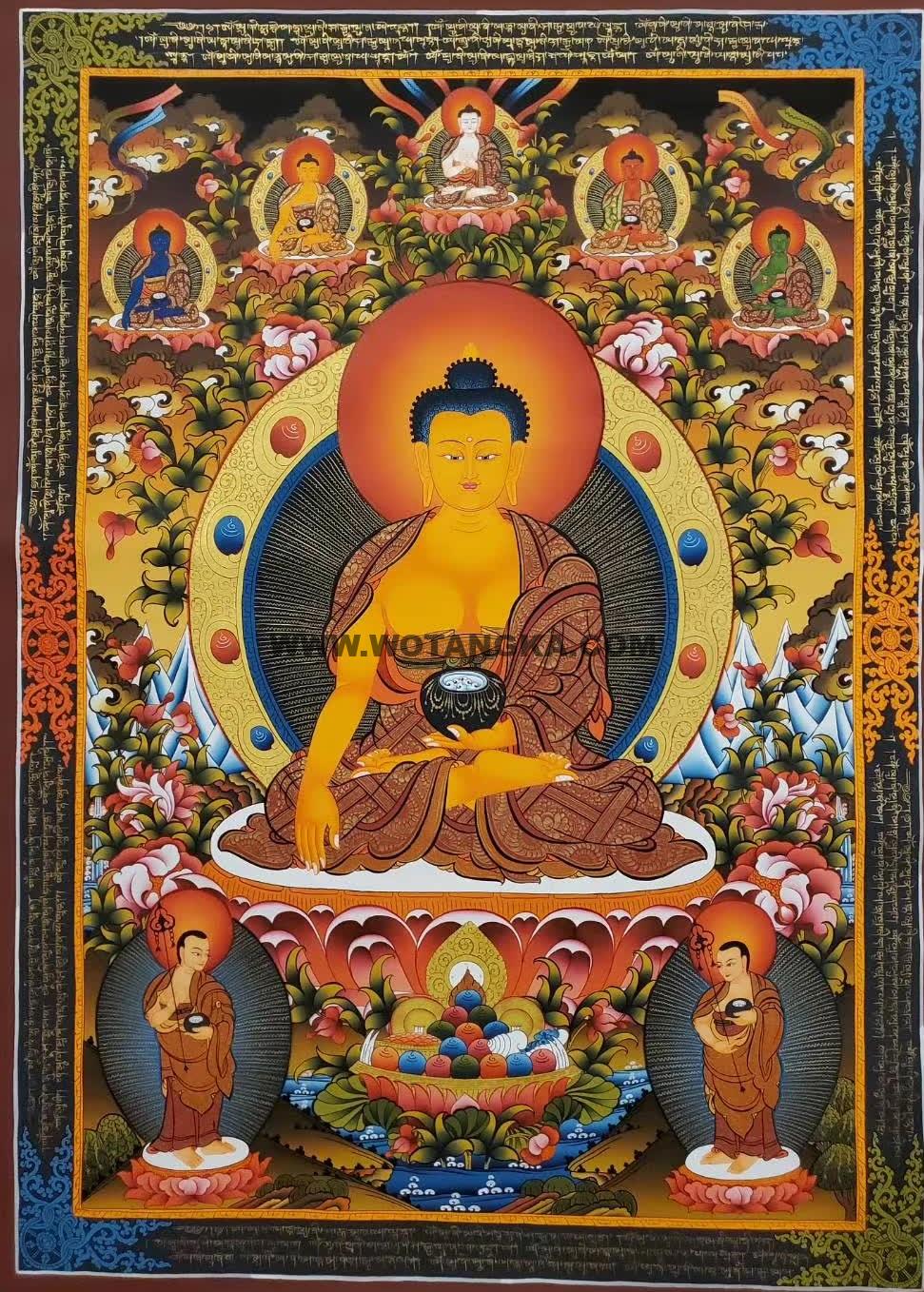 尼泊尔成名画师手绘力作,纯手绘布本唐卡【释迦牟尼佛】,作品采用24K真金金粉混合天然颜料纯手绘而成。作品主尊宝相传神。布图干净精美、画工非常的细腻,严格的遵照佛经的度量仪轨如法绘制,期待有缘人。