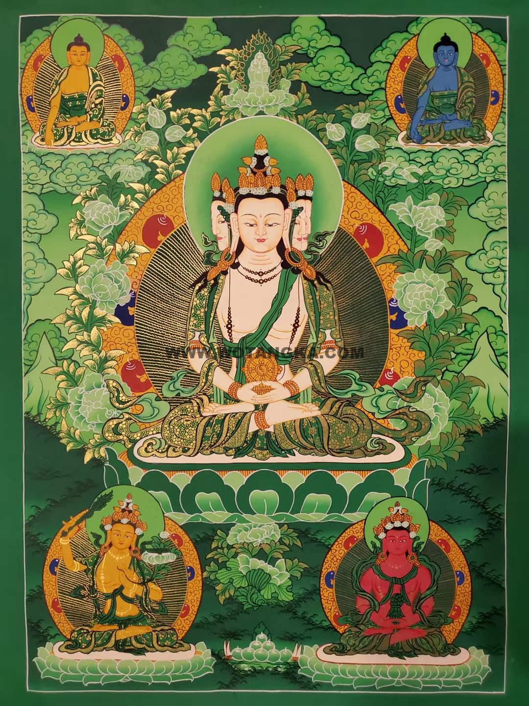 尼泊尔知名唐卡画师作品《四面大日如来》,作品采用24K真金描线,混合天然颜料纯手绘而成。作品主尊宝相传神,布图干净精美、画工非常的细腻,严格的遵照佛经的度量仪轨如法绘制,期待有缘人。