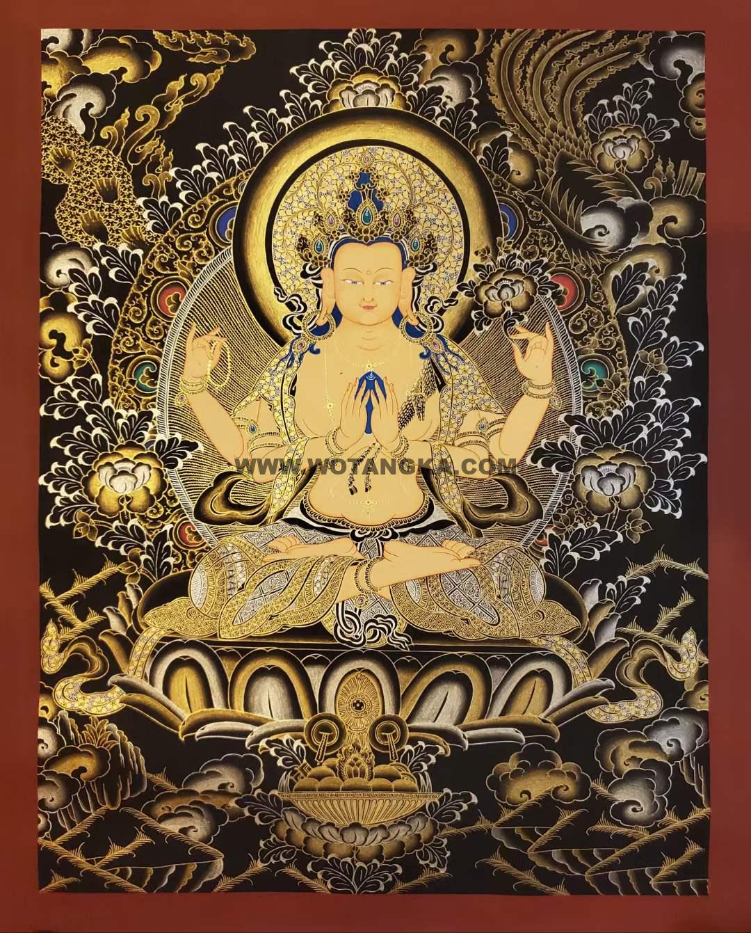 尼泊尔成名画师力作精品【四臂观音】唐卡,作品采用24K真金金粉混合矿物颜料纯手绘而成,主尊宝相传神,布图精美、画工非常的细腻,严格的遵照佛经的度量仪轨如法绘制,期待有缘人。