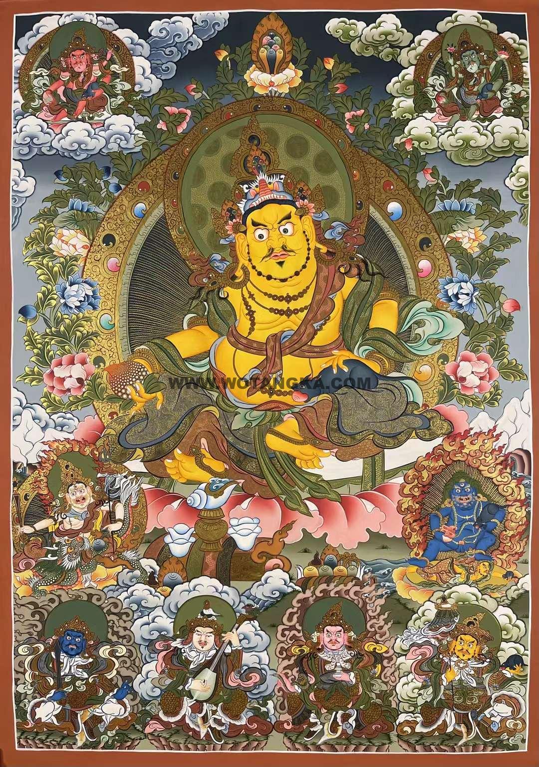 黄财神为北方司财众部之首领,掌无尽宝库,修此法者,可消灭六道穷苦,增长福德、寿命、智慧, 以及一切物质与精神上的受用。心灵上得到满足。黄财神是藏传佛教各大教派普遍供养的五姓财神之一,因其身相黄色,故称黄财神。修持黄财神法、持诵其密咒,可获得黄财神庇佑,能增长福德、寿命、智能、物质及精上之受用,不被生活所逼,以及一切经济压迫,可安心向道。但修法者需发无上菩提心,广结善缘,勤行布施。万勿悭贪成性,护法降罪也. 黄财神面慈目善,头戴宝冠,坦胸露腹,戴着珍宝璎珞、珍宝耳环、珍宝手镯和珍宝足钏,上身穿丝制天衣,下身着丝制裙子,右手于右膝上捧喷焰末尼,左手握着吐宝鼬,以威镇坐姿坐在莲花宝座中央。身后有光环、祥云、远山。能增长福德、寿命、智慧、物质及精神上之受用。主司财富,能使一切众生脱于贫困,财源广进。