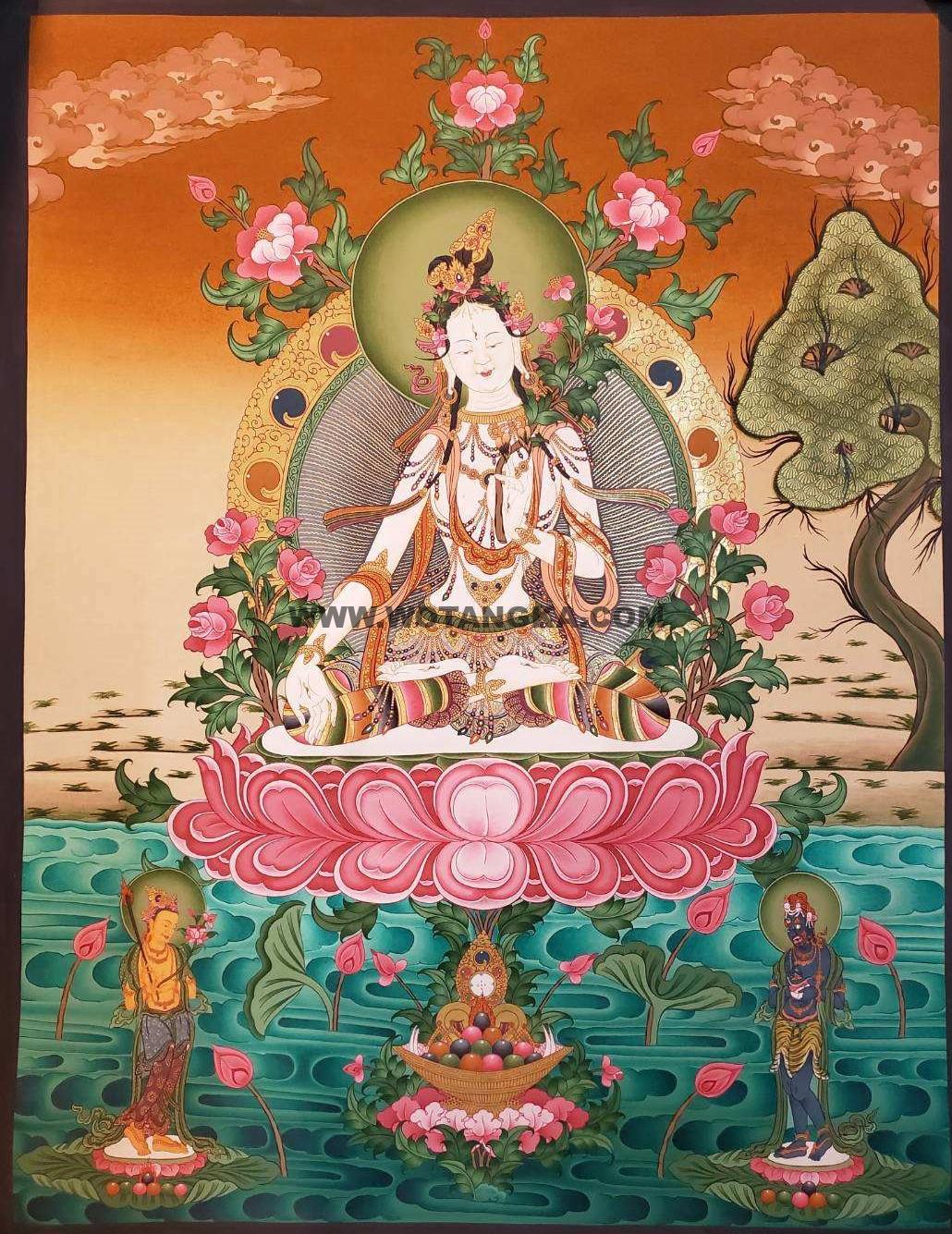 尼泊尔著名唐卡画师手绘力作,纯手绘布本唐卡【白度母】,作品采用24K真金金粉混合天然颜料纯手绘而成。作品主尊宝相传神。布图干净精美、画工非常的细腻,严格的遵照佛经的度量仪轨如法绘制,期待有缘人。