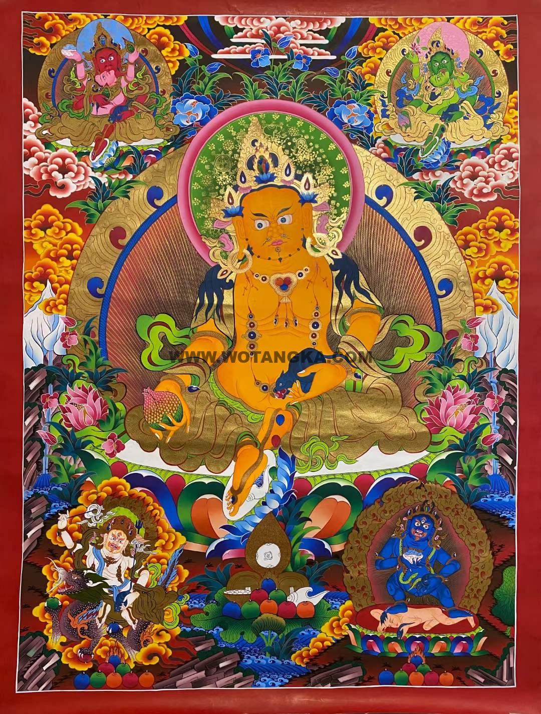 黄财神为北方司财众部之首领,掌无尽宝库,修此法者,可消灭六道穷苦,增长福德、寿命、智慧, 以及一切物质与精神上的受用。心灵上得到满足。黄财神是藏传佛教各大教派普遍供养的五姓财神之一,因其身相黄色,故称黄财神。修持黄财神法、持诵其密咒,可获得黄财神庇佑,能增长福德、寿命、智能、物质及精上之受用,不被生活所逼,以及一切经济压迫,可安心向道。但修法者需发无上菩提心,广结善缘,勤行布施。万勿悭贪成性,护法降罪也. 黄财神面慈目善,头戴宝冠,坦胸露腹,戴着珍宝璎珞、珍宝耳环、珍宝手镯和珍宝足钏,上身穿丝制天衣,下身着丝制裙子,右手于右膝上捧喷焰末尼,左手握着吐宝鼬,以威镇坐姿坐在莲花宝座中央。身后有光环、祥云、远山。能增长福德、寿命、智慧、物质及精神上之受用。主司财富,能使一切众生脱于贫困,财源广进。