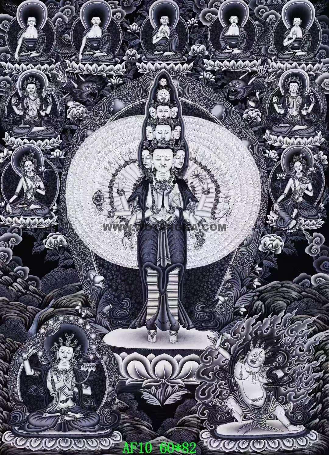 尼泊尔成名喇嘛力作【千手观音·三怙主】手绘布本唐卡,作品采用24K纯金金粉混合矿物颜料纯手绘而成。作品主尊宝相传神。布图精美、画工非常的细腻,严格的遵照佛经的度量仪轨如法绘制,期待有缘人。