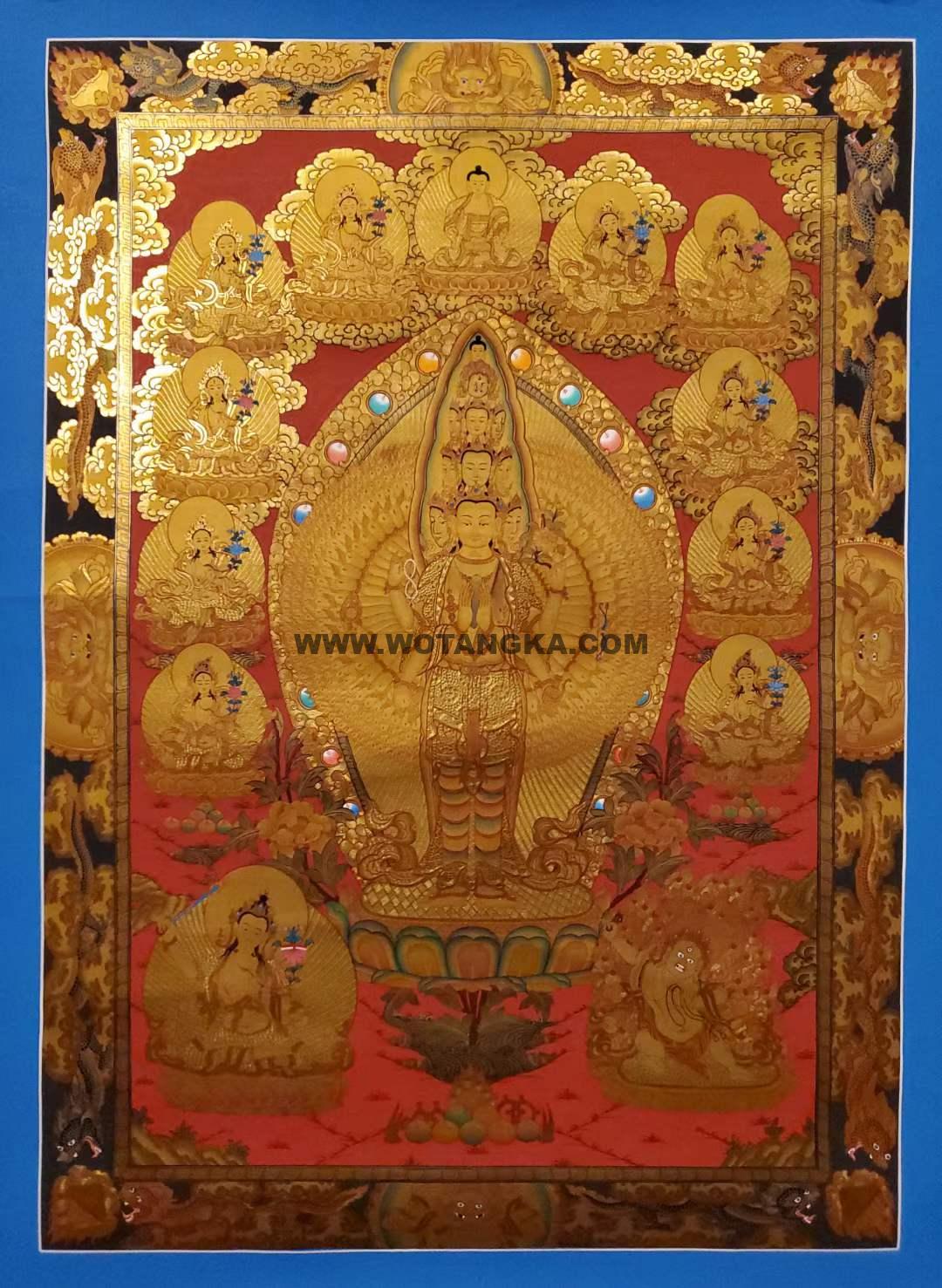 尼泊尔传统高端手绘金箔唐卡【千手观音·三怙主】。金箔唐卡也叫刻金唐卡,先在布面上施以纯金金粉或者金箔,再铅笔打底稿,矿物颜料勾勒晕染,最后用玛瑙刀雕刻出花纹,绘制过程非常复杂,绘制周期也比普通唐卡更长,而且绘制成本极高,因此这类唐卡市面上非常罕见,收藏价值不言而喻。