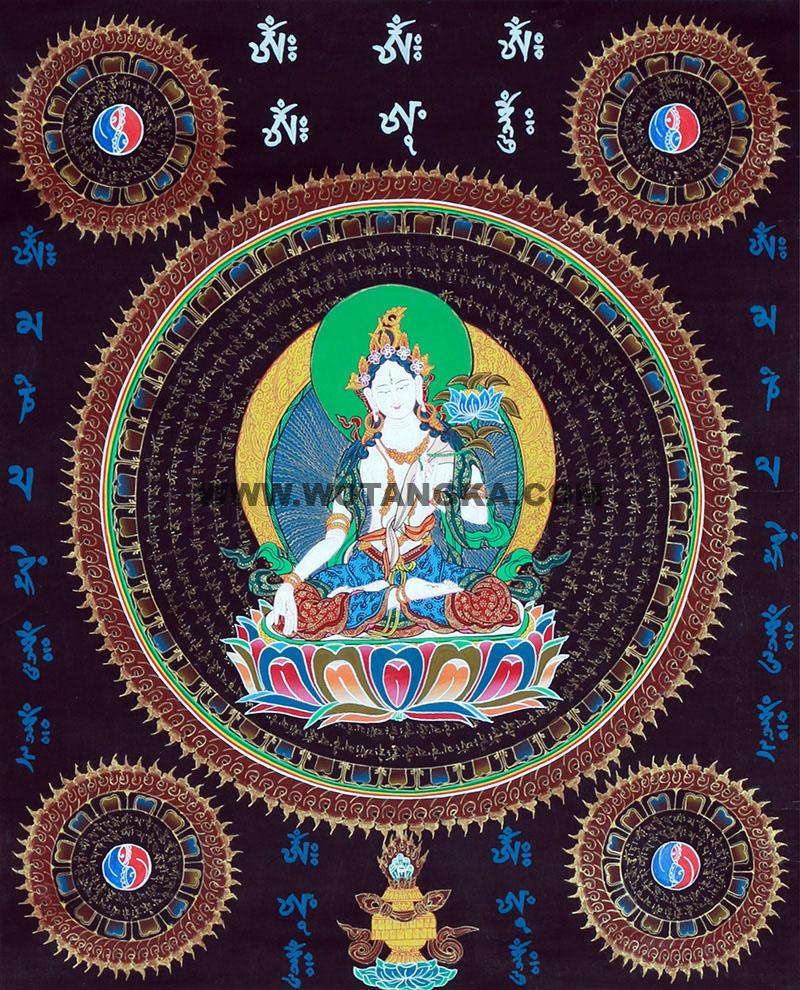 白度母是一切众生尤其是女性的无比圣神,是保佑心想事成、赐寿除障的如意宝。白度母集二十一度母之功德于一身,能消除病痛邪风、妖魔鬼怪等外部之障与贪嗔痴等内部之障,勇猛无比,形随众生,变幻莫测。如果虔诚地修持她的法门,也可以使智慧迅速増长。