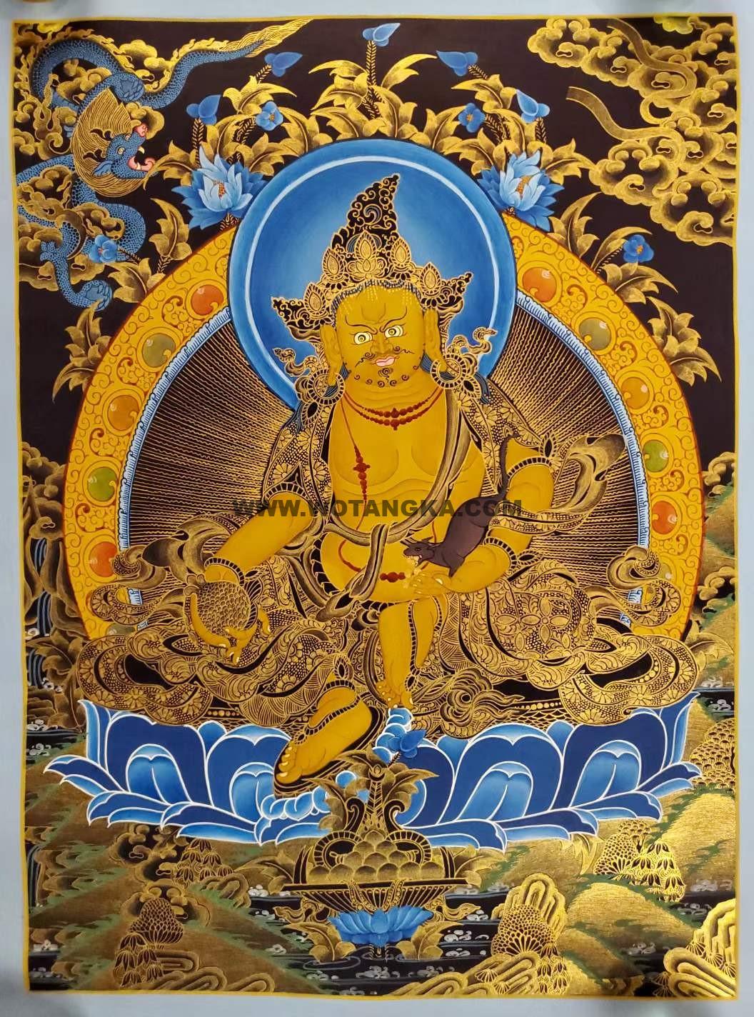 尼泊尔成名画师力作精品【黄财神】唐卡,作品采用24K真金金粉混合矿物颜料纯手绘而成,主尊宝相传神,布图精美、画工非常的细腻,严格的遵照佛经的度量仪轨如法绘制,期待有缘人。
