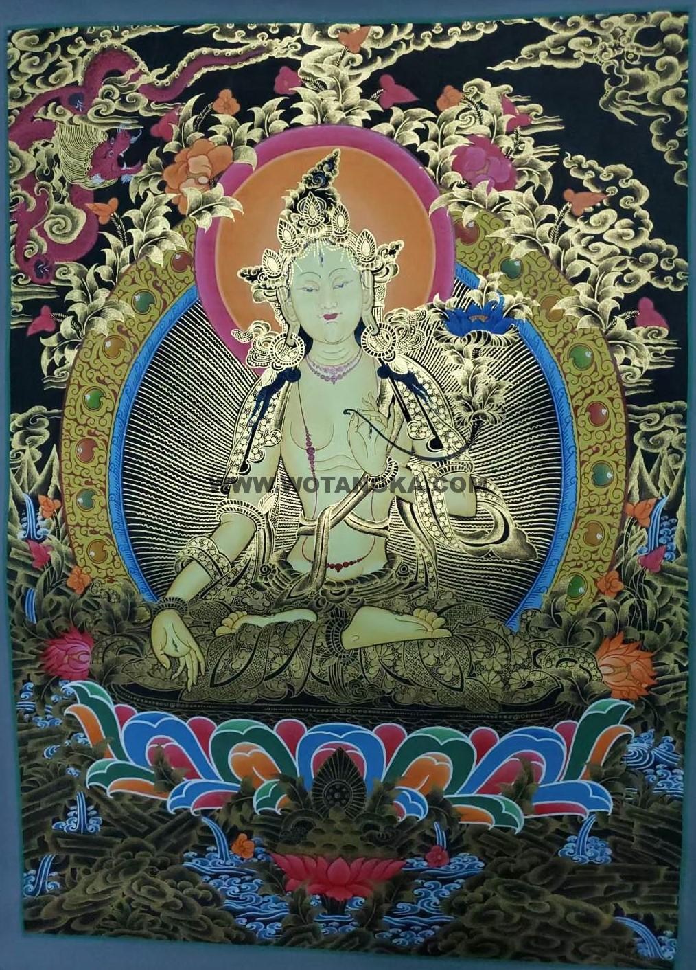 尼泊尔成名画师力作精品【白度母】唐卡,作品采用24K真金金粉混合矿物颜料纯手绘而成,主尊宝相传神,布图精美、画工非常的细腻,严格的遵照佛经的度量仪轨如法绘制,期待有缘人。