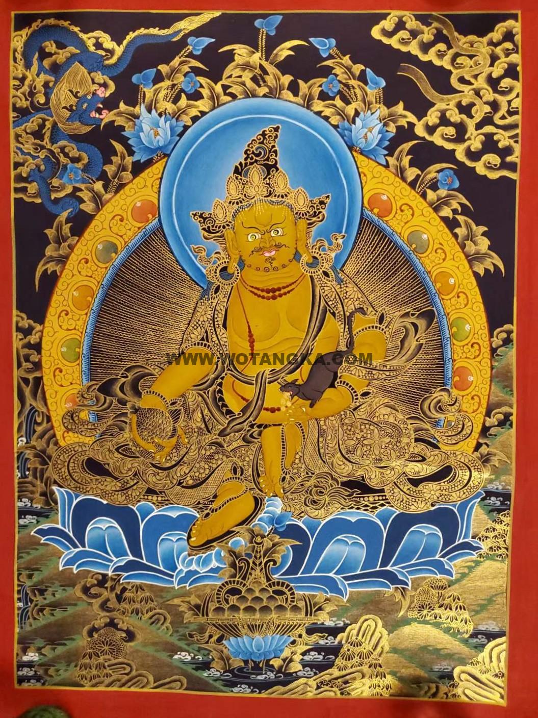 尼泊尔成名画师力作精品【黄财神】唐卡,作品采用24K真金金粉混合矿物颜料纯手绘而成,主尊宝相传神,布图精美、画工非常的细腻,严格的遵照佛经的度量仪轨如法绘制,期待有缘人。